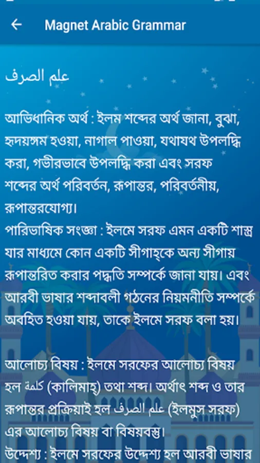 এছাড়াও অারবী সাহিত্য, হাদিস শরীফ, ফিকহ শাস্ত্র ইত্যাদি বোঝার জন্য অারবী গ্রামারের বিকল্প নেই। কোনো ভাষার প্রাণ হল স্বীয় ভাষার গ্রামার। তাই Magnet Arabic Grammar বইটিতে প্রতিটি অধ্যায় অত্যন্ত যত্নসহকারে সহজ ভাষায় গুছালো ভাবে বর্ণনা করা হয়েছে।
