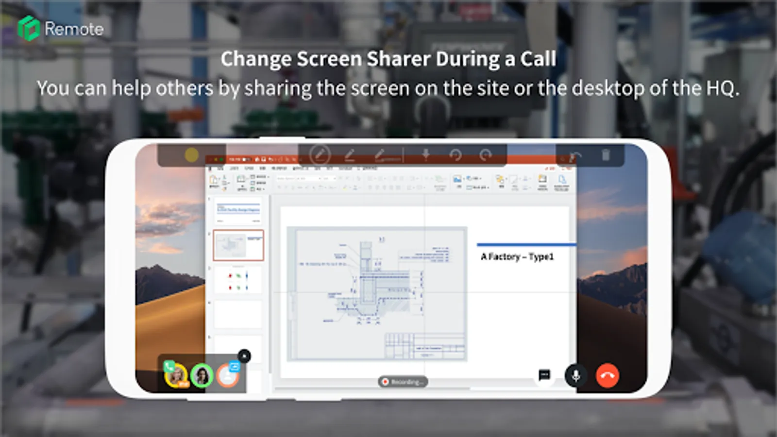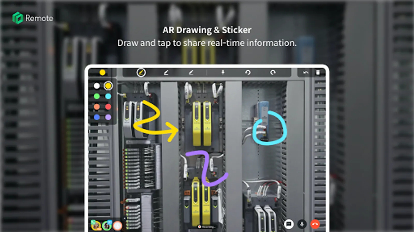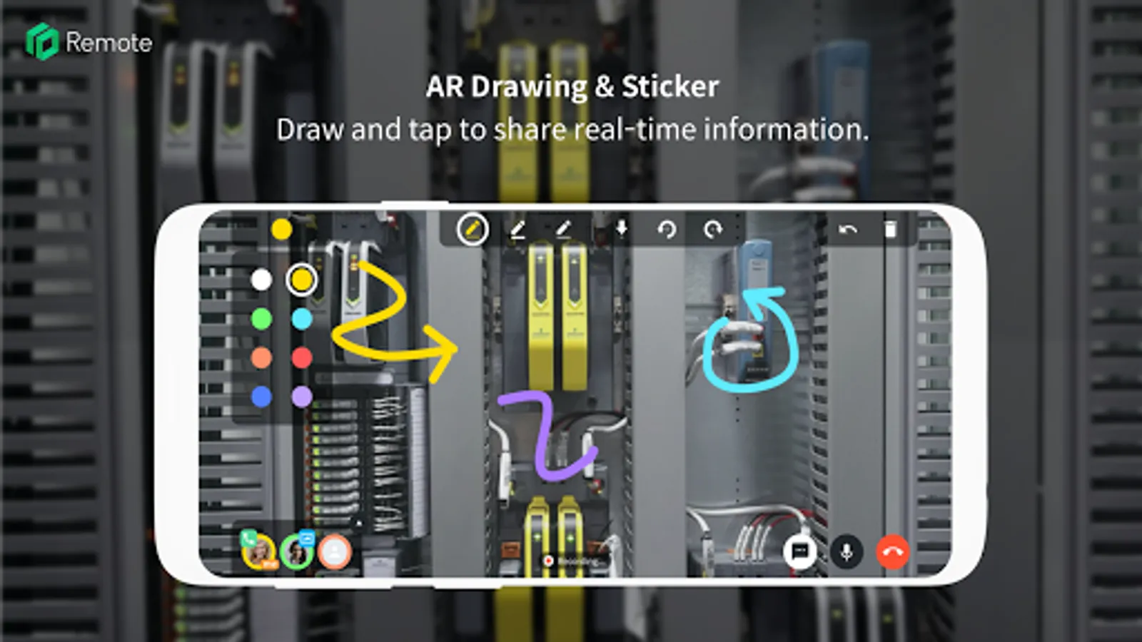 With AR technology, you can draw lines and add stickers on the screen to give a help more intuitively and practically. In addition, various ways of remote support are possible by sharing files such as text and images through a chat panel.