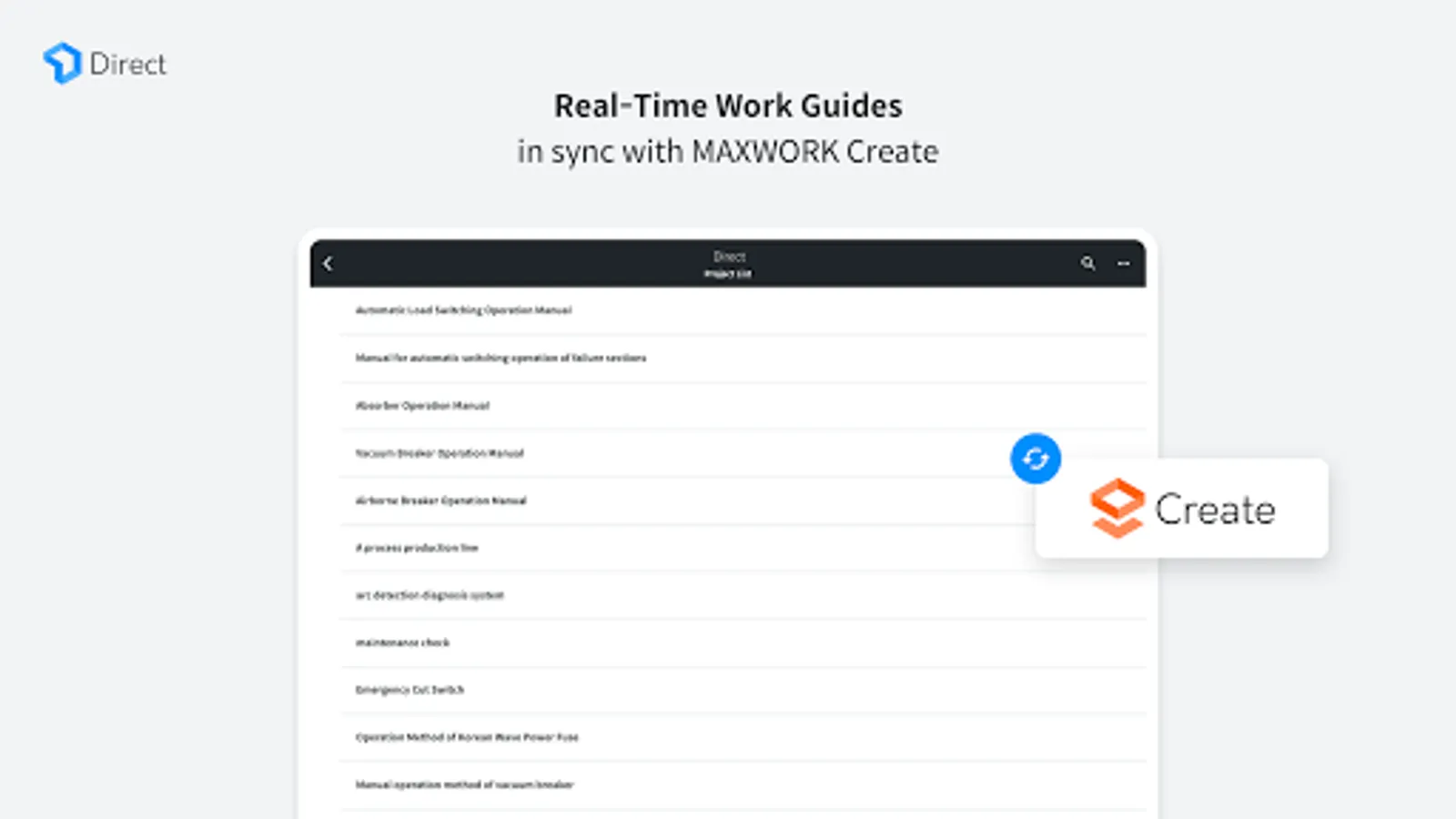 Point the camera at the QR code or target image to overlay relevant AR manuals on top of the equipment without the hassle of carrying manuals around or searching information. Accurate and intuitive AR manuals in MAXWORK Direct enable users to quickly get their job done without errors.