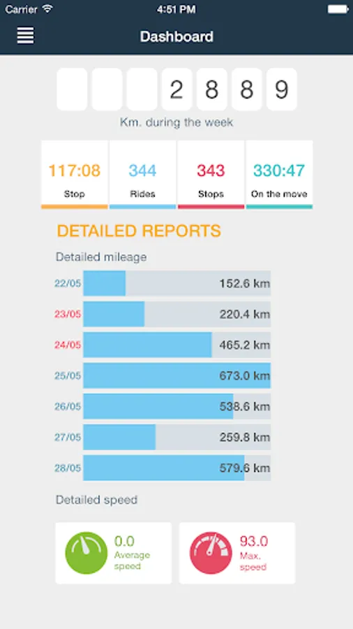- Possibility to watch track of the day and to receive all information regarding movement of vehicle within one day period