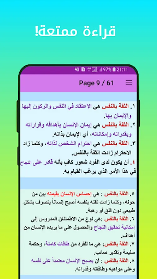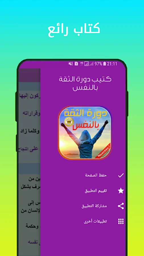 A necessary course for acquiring and enhancing self-confidence in every individual ... the concept of self-confidence ... the relationship between self-confidence and the psychological state ... the relationship between self-esteem and self-confidence ... positive self-image ... self-confidence and achieving goals .. Self-confidence is not born with a person but is acquired from the environment surrounding him ... The keys to self-confidence ... The fall of a person is not a failure but failure to remain where he fell ... Steps to make a decision ... How to gain self-confidence ... skills To strengthen the personality and enhance self-confidence ... The difference between self-confidence and vanity ...