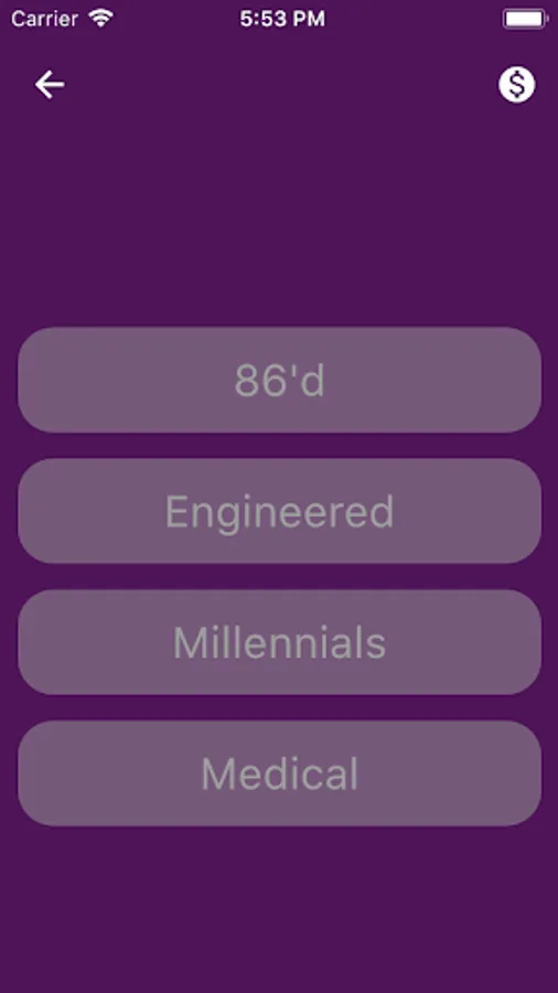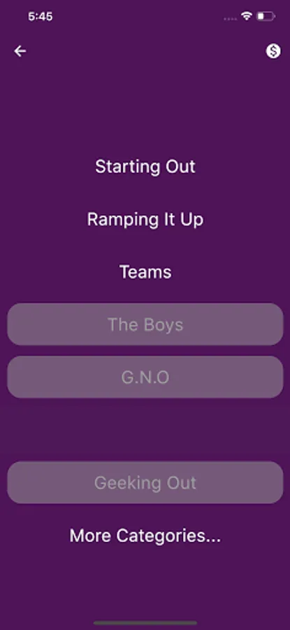 Current Categories: Starting Out, Ramping it Up, Teams, The Boys, G.N.O. (Girls Night Out), Geeking Out, 86'd, Engineered, Millennials, Medical, I Love College, and General Trivia. With many more to come (After Wedding, Bar Down)