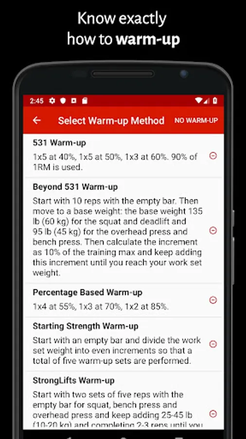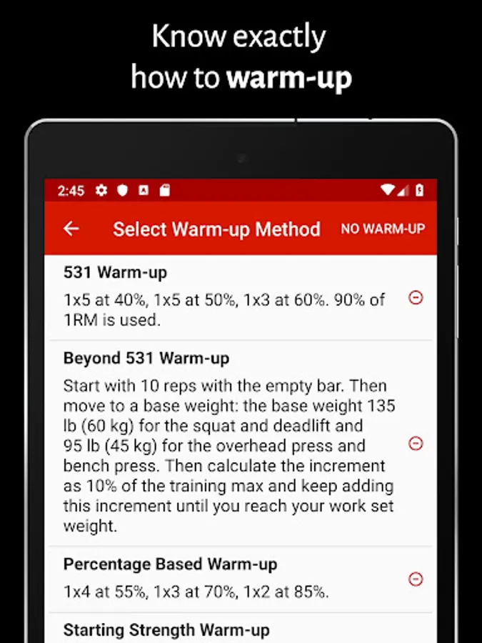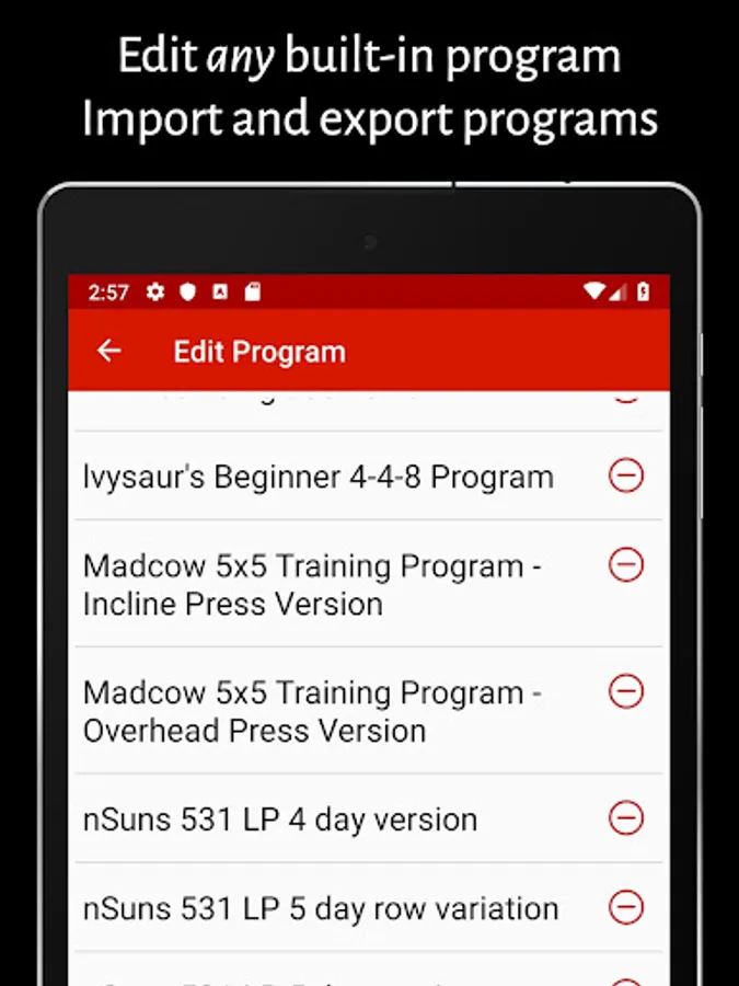 - Integrates many workout programs including StrongLifts, Starting Strength, GreySkull LP, Push pull legs, Wendler 531, and many more coming soon.