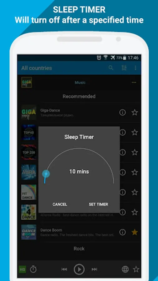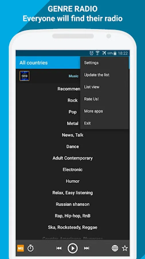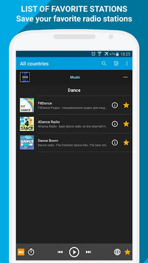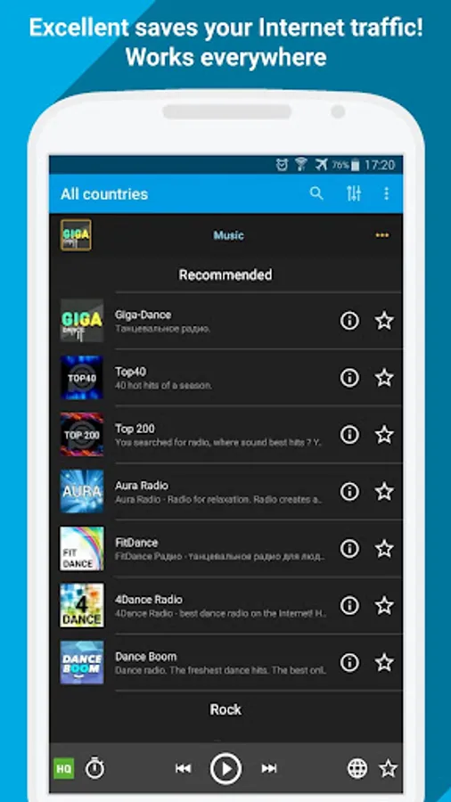 Now you can listen to all the stations in high quality even with low speed Internet connection. Enjoy your favourite radio stations everywhere – whether you are driving your car or having a picnic with your friends – all you need is mobile Internet (24 Kbit/sec and more).