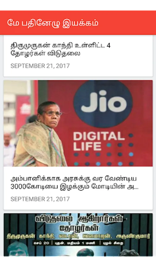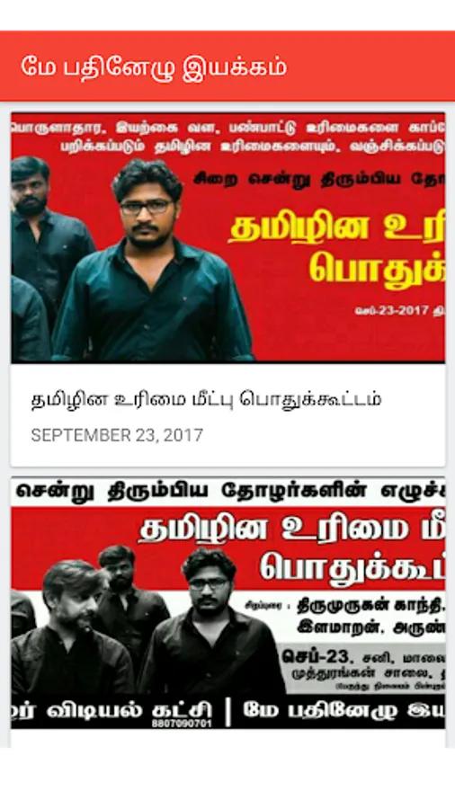 The May 17 Movement was born out of the pain inflicted by 2009 Tamil Eezham genocide. The Tamil politicians remained idle, mute spectators of the genocide. The agonized youth joined hands to form a new Political movement. The movement's struggles are to draw the attention of Tamil and international community towards the legitimacy of Tamil Eezham, and to knock at the doors of justice councils seeking justice for genocide. Additionally, the movement works at an intellectual space to expose the Brahminical-Bania government's projects designed to plunder the livelihoods of Tamils and construct struggles to liberate the clutches of Brahmin-Baniya exploitation.