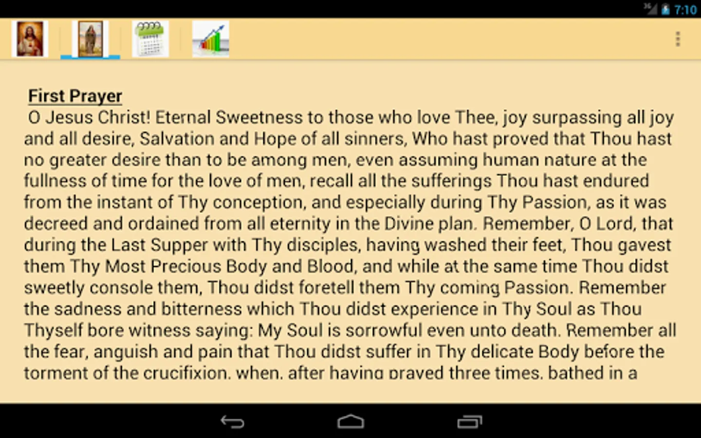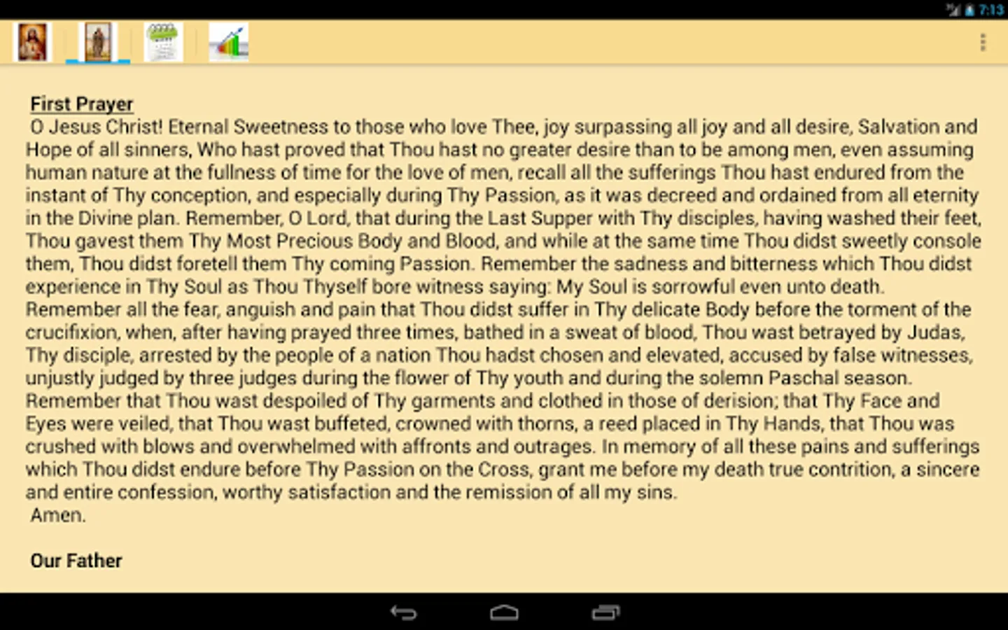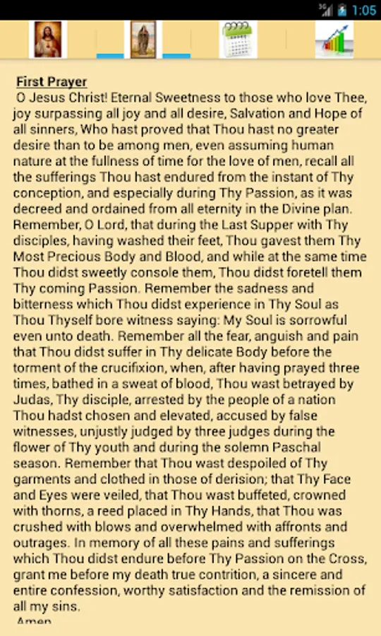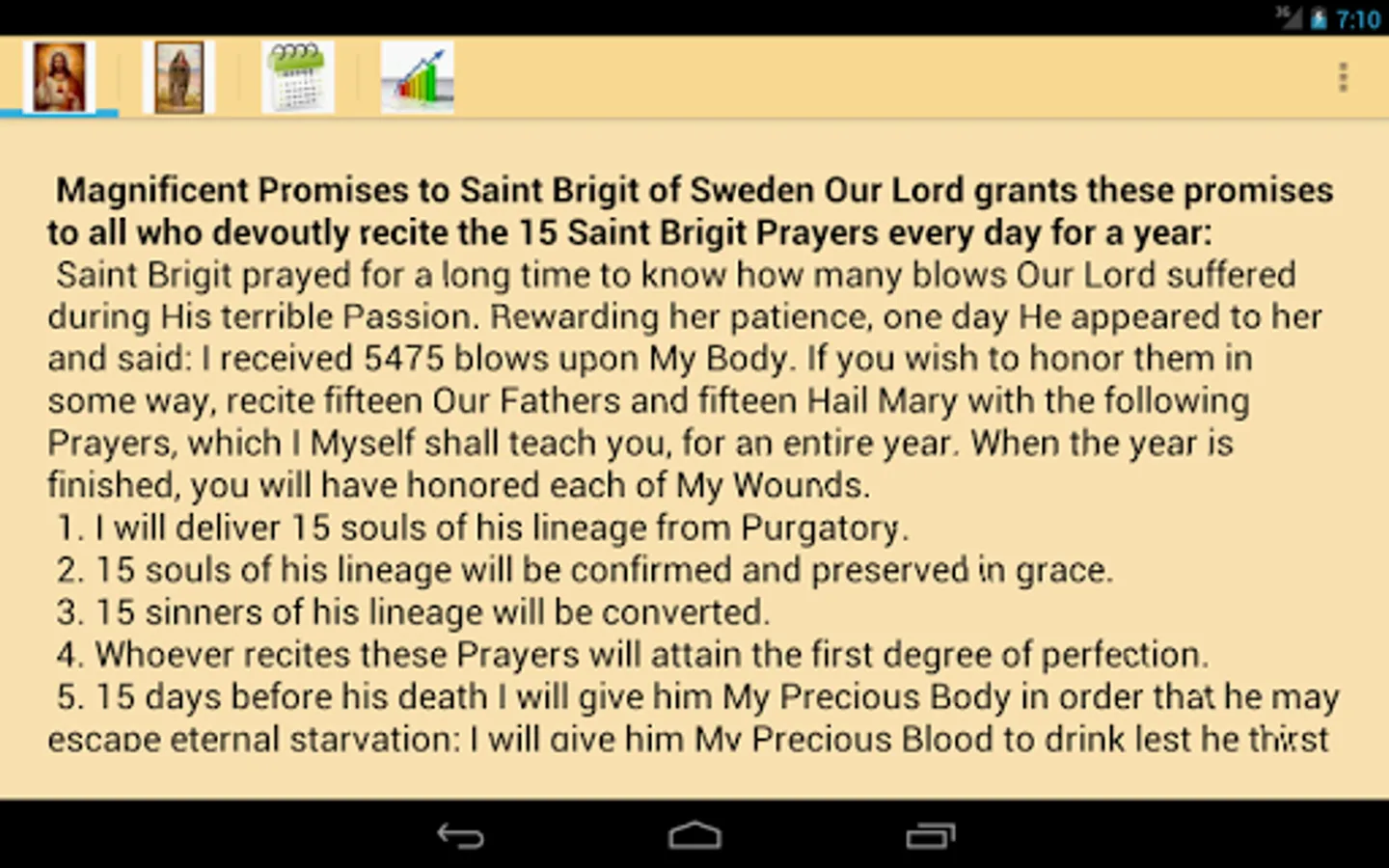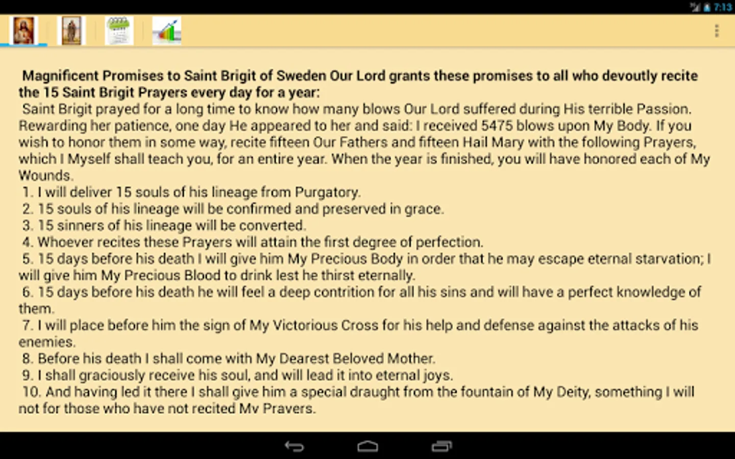 "I received 5475 blows upon My Body. If you wish to honor them in some way, recite fifteen Our Fathers and fifteen Hail Mary with the following Prayers, which I Myself shall teach you, for an entire year. When the year is finished, you will have honored each of My Wounds."