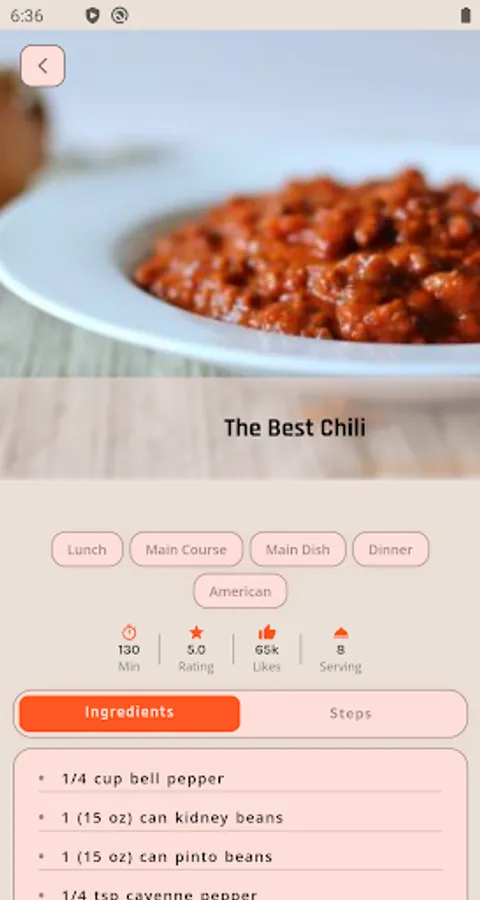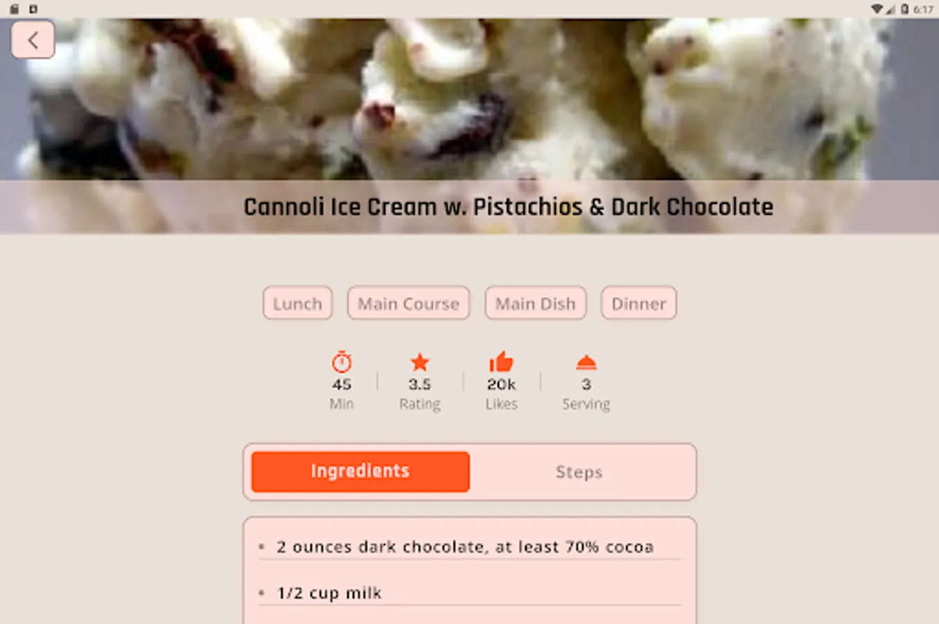 * Detailed information for recipe, such as cooking time, serving persons, rate and likes, ingredients and step by step.