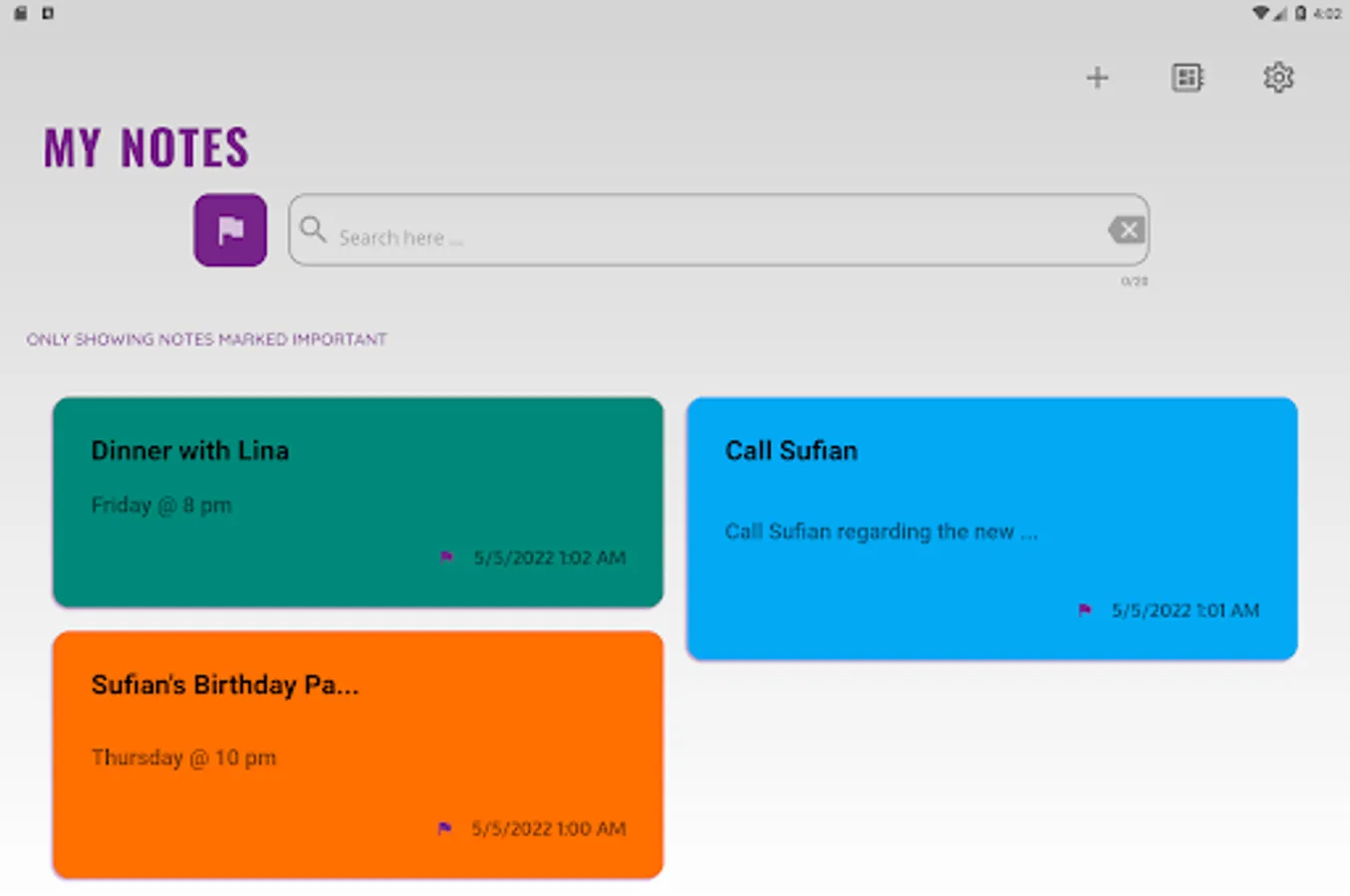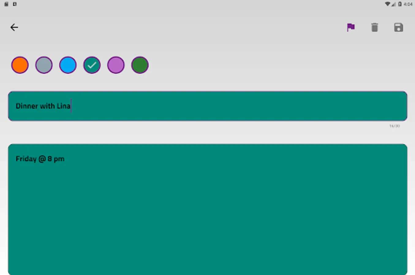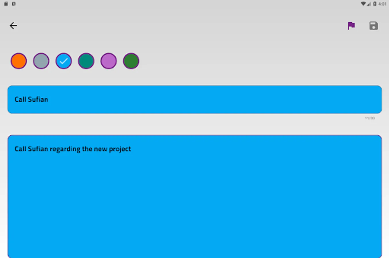 - Click on the (+) icon to add a new note, choose a color and fill in the title and description of the note, you can also mark the note as important if you want.