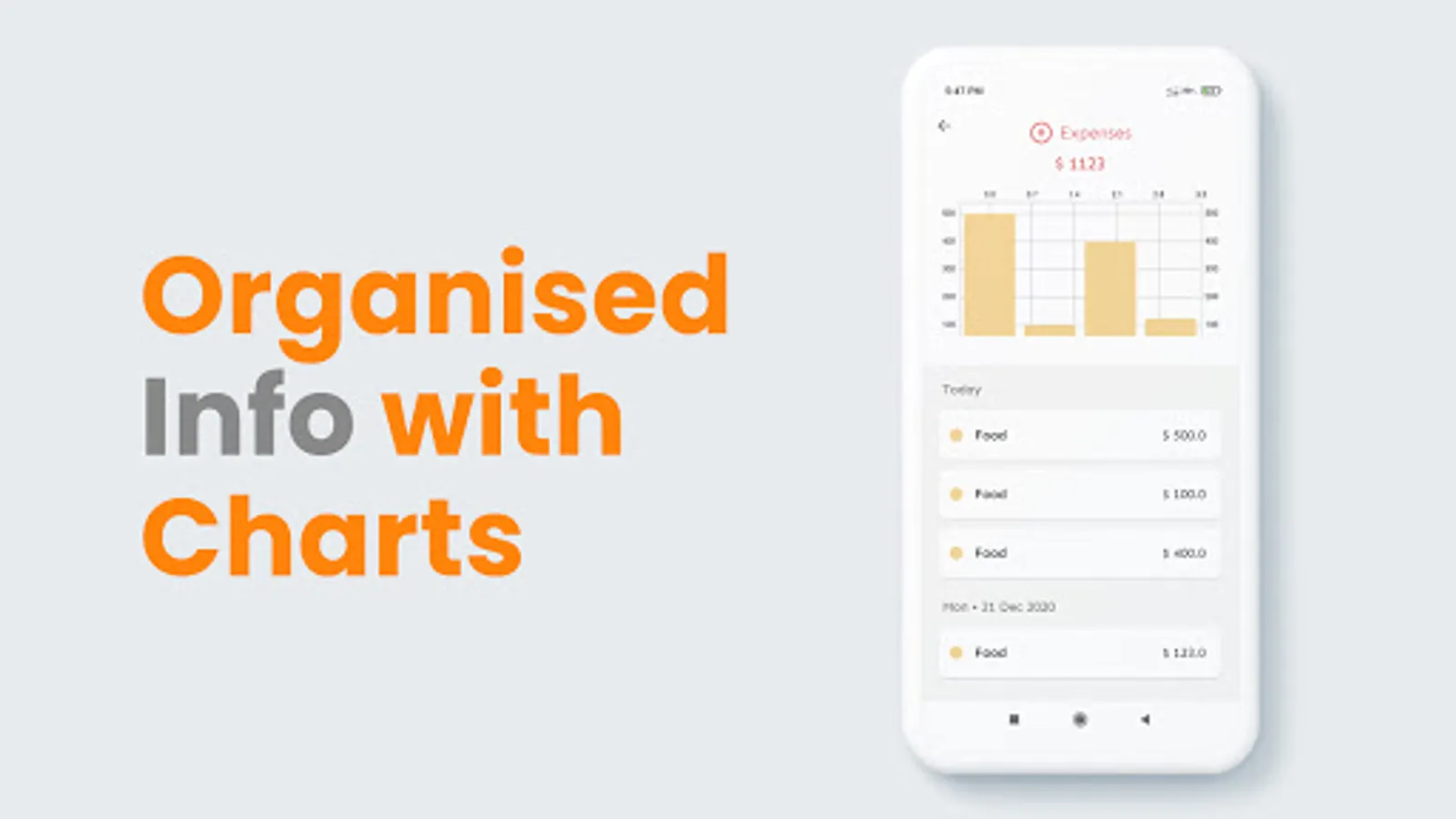 This app provides a neat and clean view of your personal financial transaction with visualized charts based on time period and category.