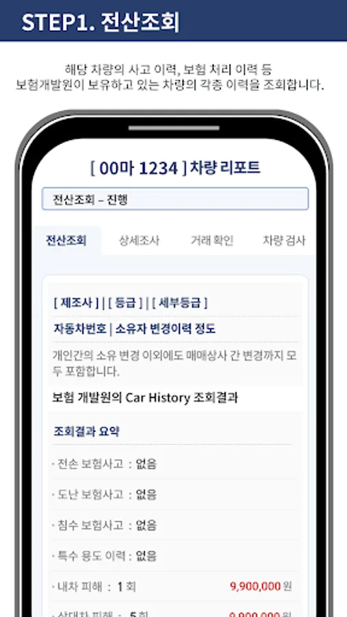 해당 차량의 사고 이력, 보험 처리 이력 등 보험개발원이 보유하고 있는 차량의 각종 이력을 조회합니다.