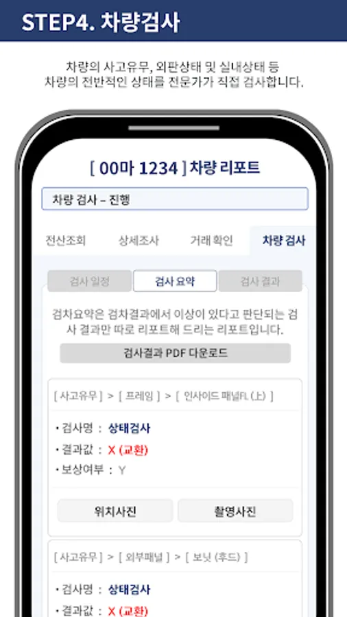 중고차를 구매할 때 검증해야 하는 영역을 크게 4단계로 구분하여 차량의 상태를 확인합니다.