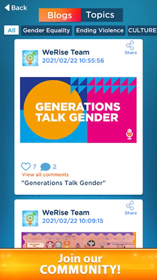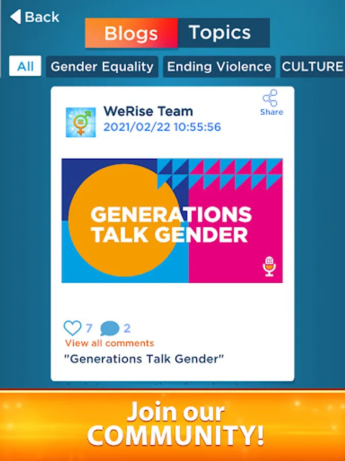 Join the WeRise community through a journey on gender equality and women’s empowerment! With customizable plug-ins and an interactive interface, play solo challenge your friends in three exciting mini-games - quiz, word search, or picture puzzle - to progress through the map and beat the leaderboard. Interact with other users on the community page, and share blog posts, videos, comments, forum questions, follow any topic of preference and stay informed about future events.