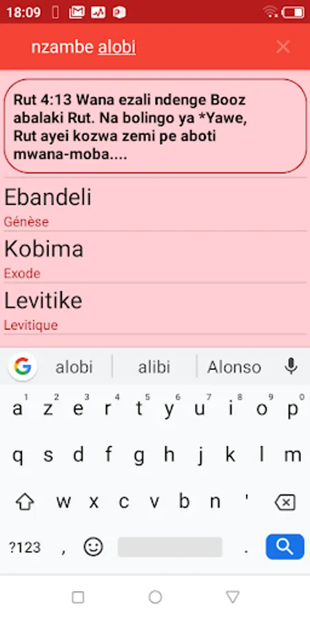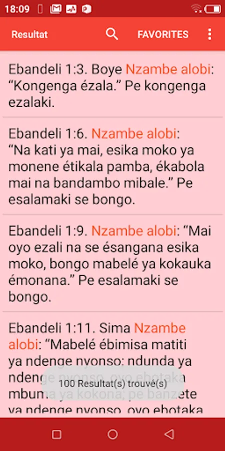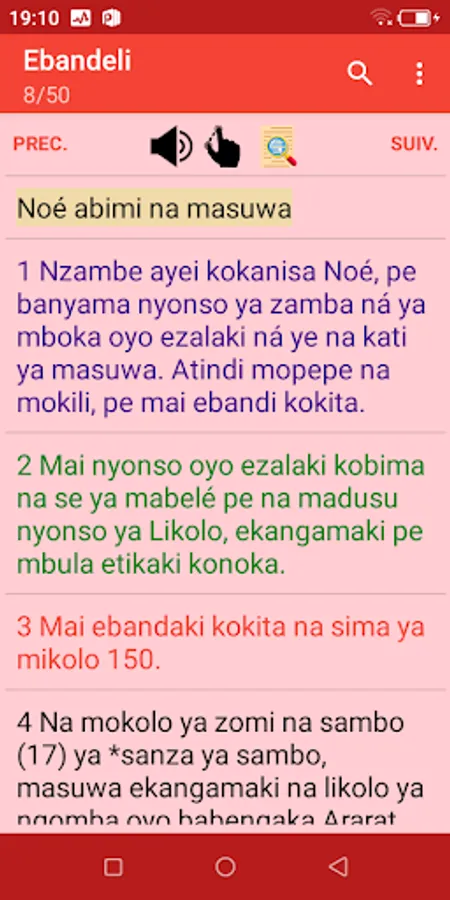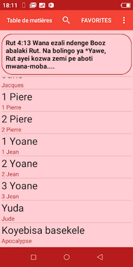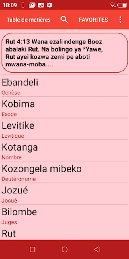 • All the names of books are also translated into French to make it easier to find the book you are looking for (Lingala in black and French in red see the interface after the start screen).