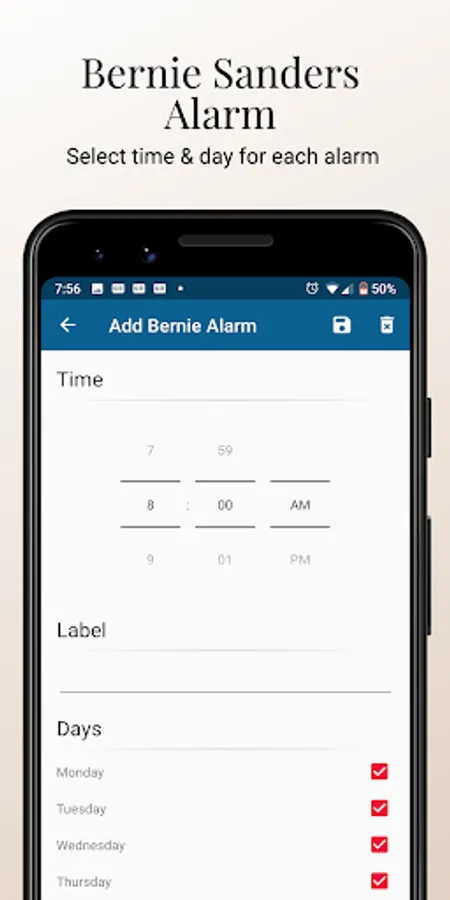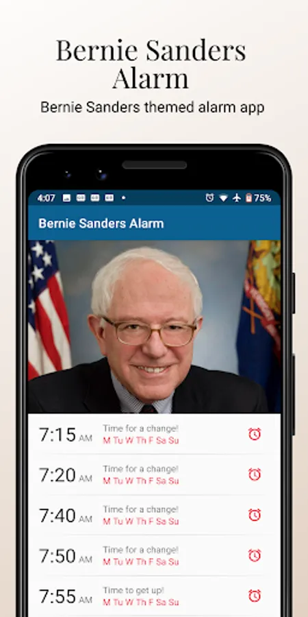 Bernie Sanders Alarm is the only Bernie Sanders alarm clock for Android. With its beautiful and easy to use interface, Bernie Sanders Alarm is a pleasure to use and will integrate seamlessly into your life. Choose from a variety of different inspirational sound clips.
