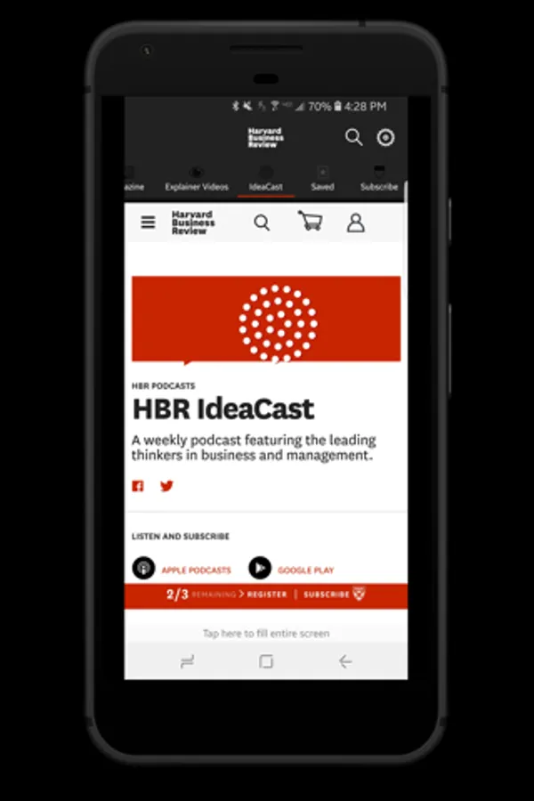 Welcome to the official Harvard Business Review mobile app. Renowned for excellence in publishing industry-leading business management, HBR now provides you with the ability to access the power of the print magazine, alongside our most important explainer videos, and award-winning podcasts on your mobile device. Reading, sharing, and interacting with HBR content is easier than ever before.