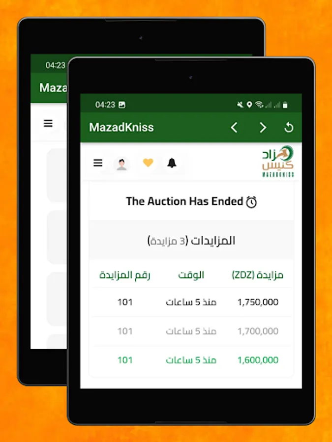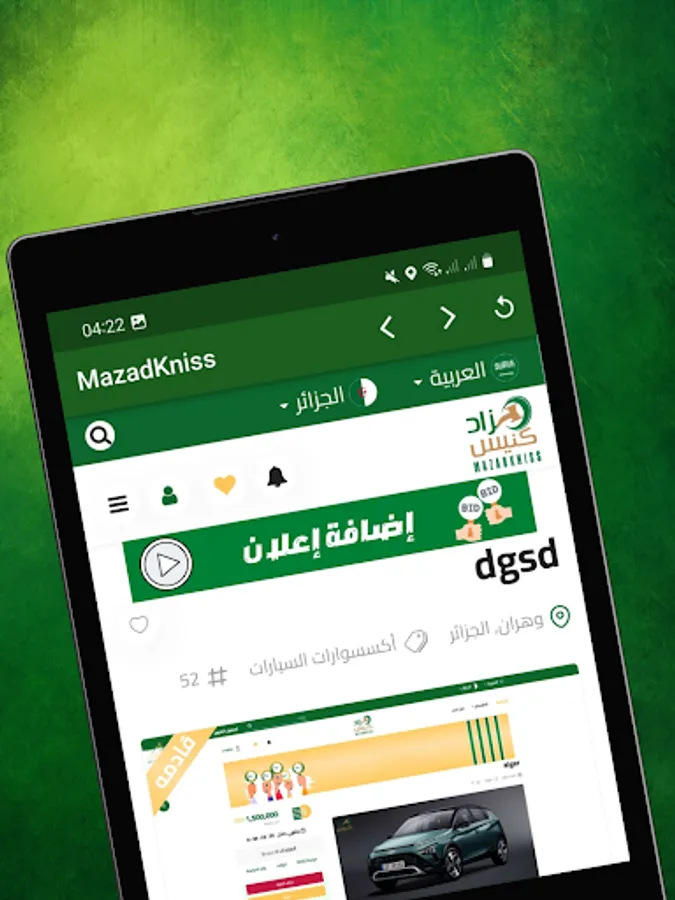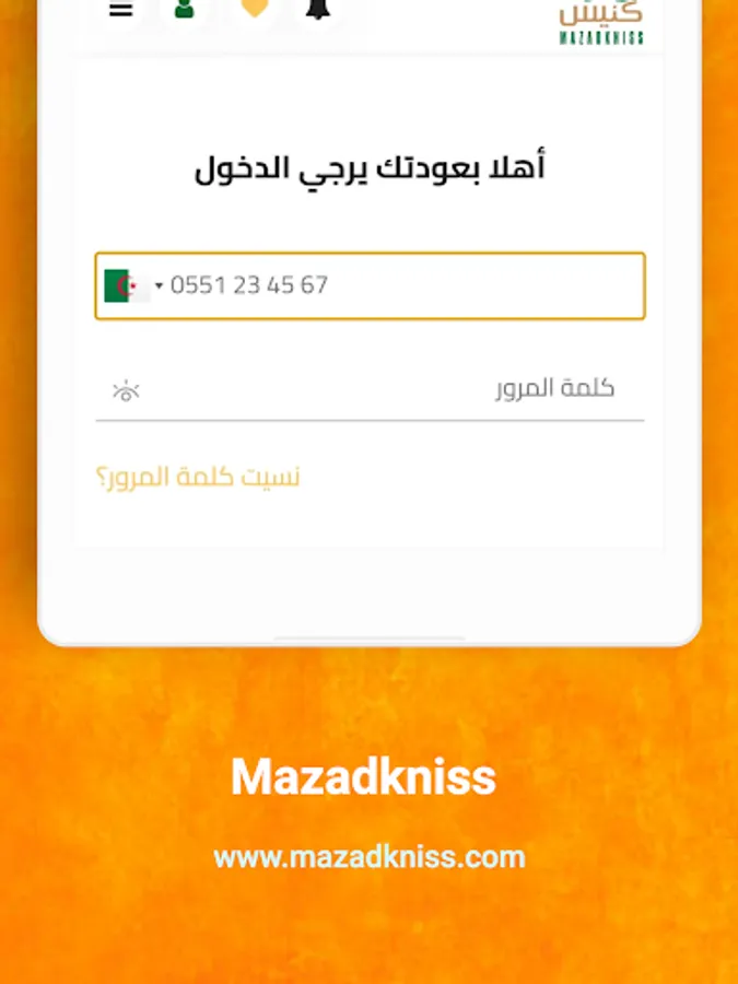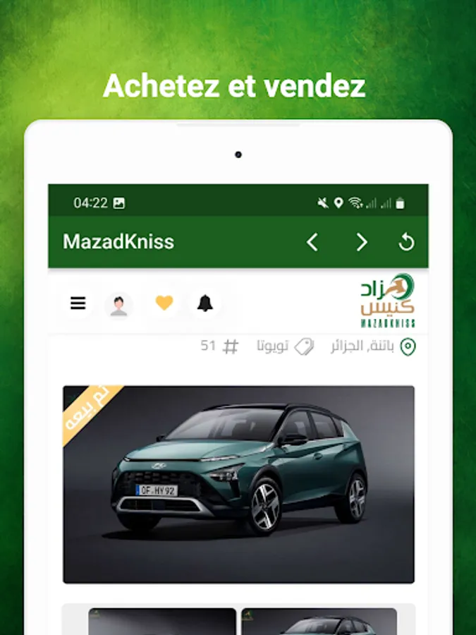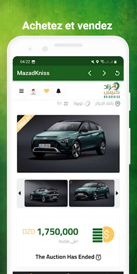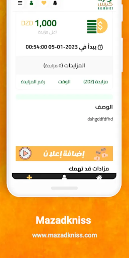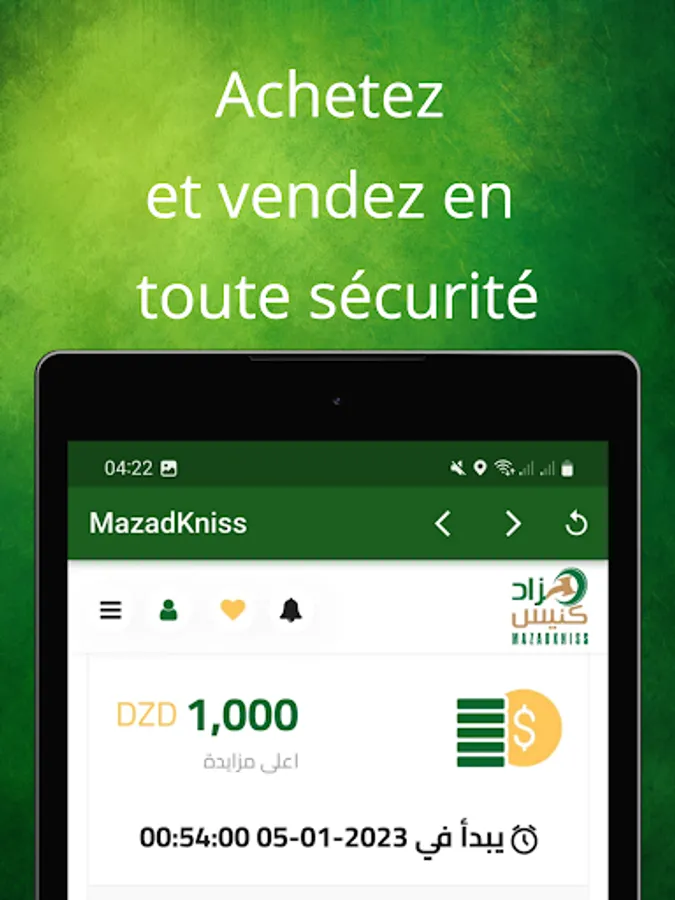 Application Mazadkniss en Algérie pour offrir aux acheteurs et aux vendeurs une autre opportunité de vendre leurs produits dans une vente aux enchères en ligne. Dans le but d'offrir aux vendeurs et aux acheteurs la possibilité de se rencontrer grâce à notre service d'enchères en ligne complet basé sur la technologie numérique moderne, nous négocions la transaction avec le plus haut niveau de service personnalisé. Aujourd'hui, nous opérons dans tout le pays et sommes le service d'enchères en ligne à la croissance la plus rapide en Algérie.