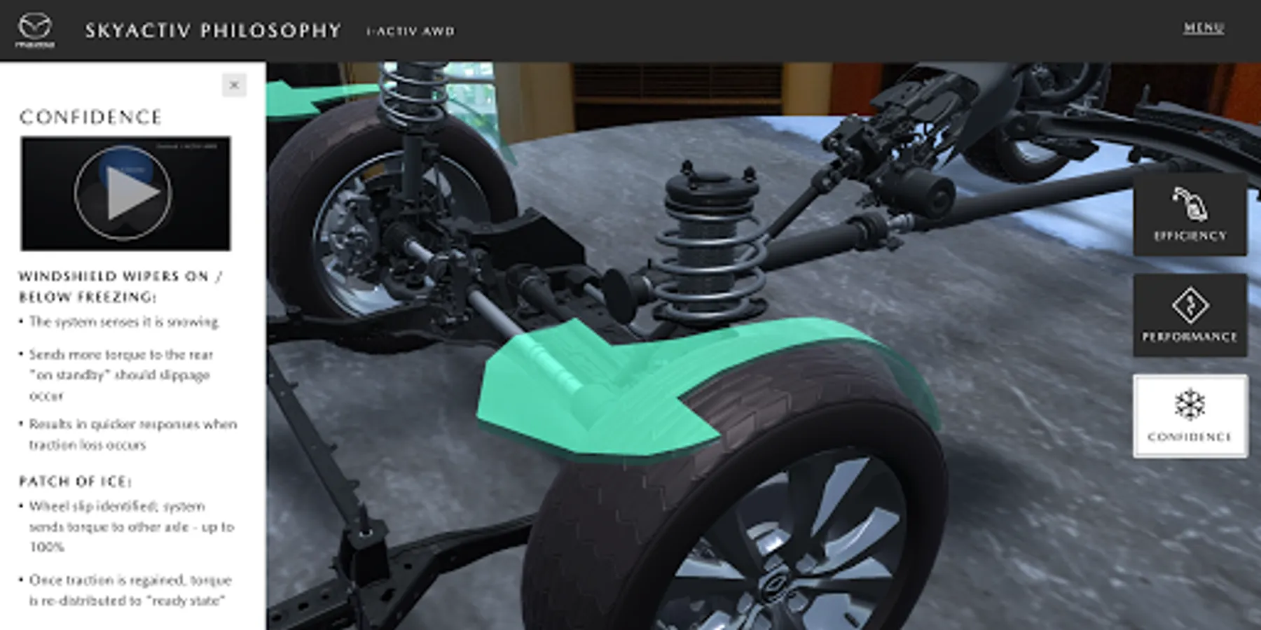 The Mazda Vision Augmented Reality App is an engaging, interactive way for Mazda brand ambassadors and enthusiasts to experience vehicles in the Mazda portfolio. Via Augmented Reality (AR), you’ll be able to explore not only the vehicle’s exterior and interior, but also peel back the layers and take a look at under-the-skin features and technologies such as Mazda’s unique Skyactiv®-Vehicle Architecture and i-Activ AWD®! And, as you engage with the virtual Mazda vehicle, you’ll discover key product stories, competitive advantages and more.