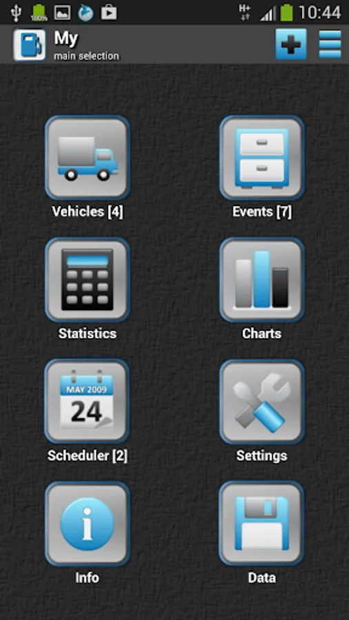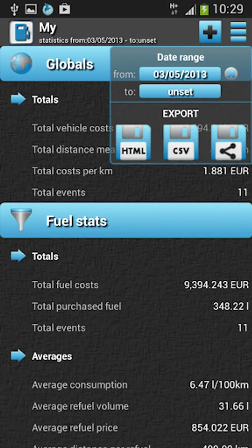 - statistics: fuel consumption, service costs, averages, min/max, ...