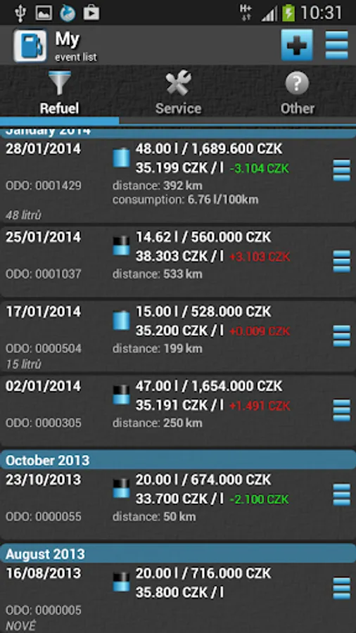 - keep track of refuels, service and other events with possibility to insert / update back in time