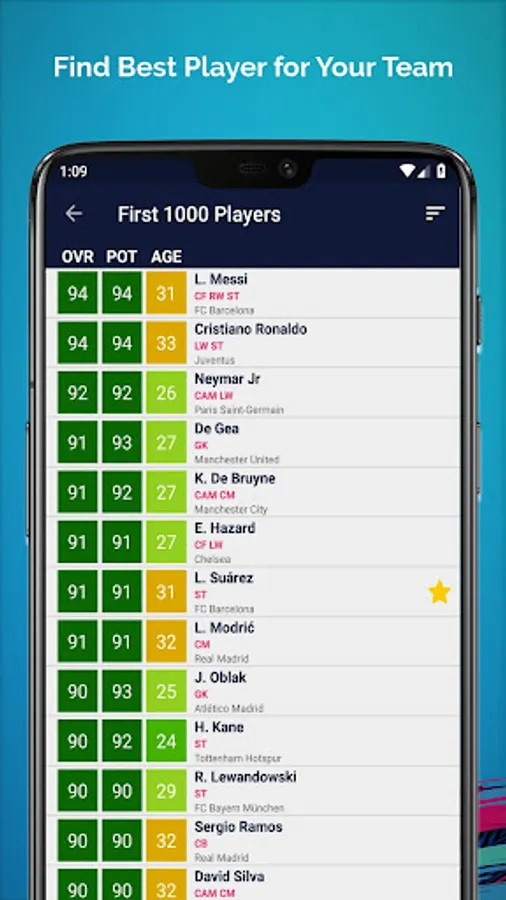Player Potentials 19 application has 9 different free filter options. With Overall Rating, Potential Rating, Age, Preferred Positions, Nationality, League, Club, Contract and Skill filters it is very easy to search and find players for your career mode team in FIFA 19 game. This application will be your biggest guide during the transfer seasons.