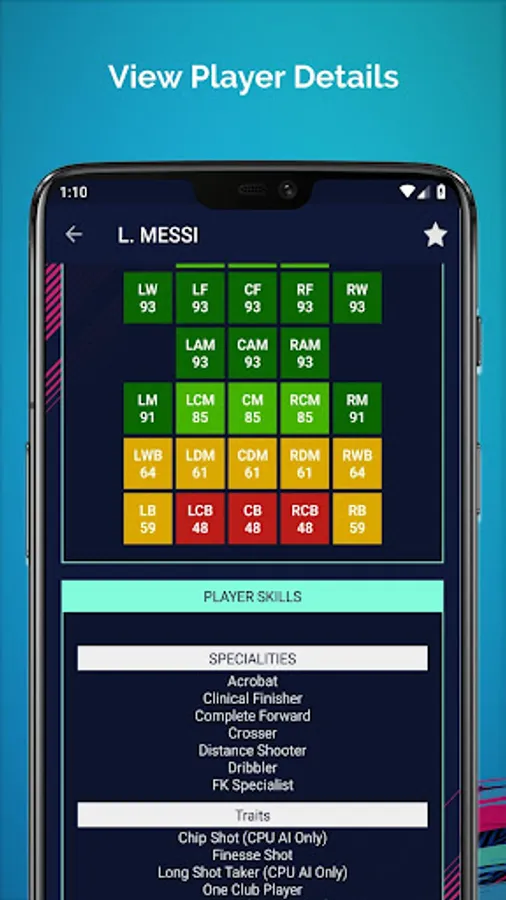 In Player Details page you can see very detailed data like Player Photo, Player Full Name, Preferred Positions, Preferred Foot, Day Of Birth, Height, Weight, Contract End Date, Wage, Value, Release Clause, Specialties, Traits, Weak Foot, Skill Moves, Work Rates and Player Ratings Per Positions.