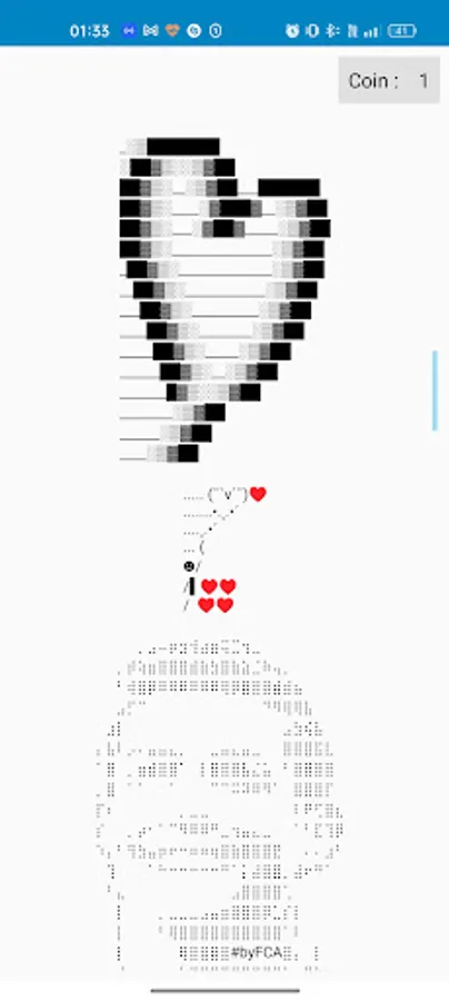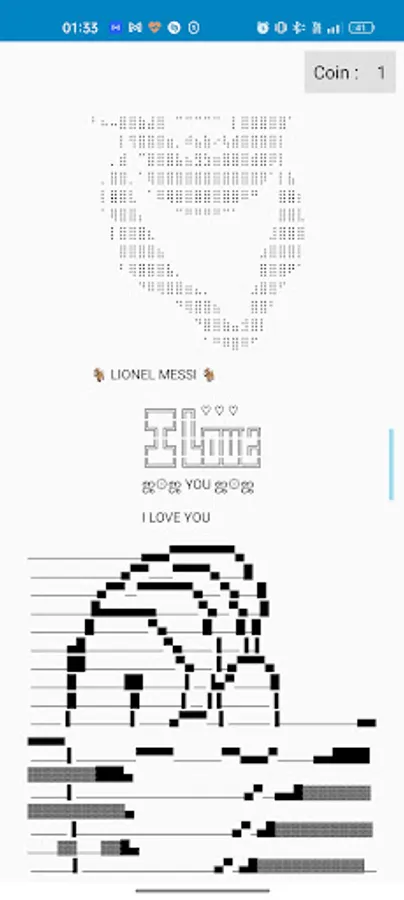 With this application you can easily find hard-to-find Text arts and text images. It offers a fluent use thanks to its easy use and simple interface.To copy any text you want, just click on it. Have fun everybody.