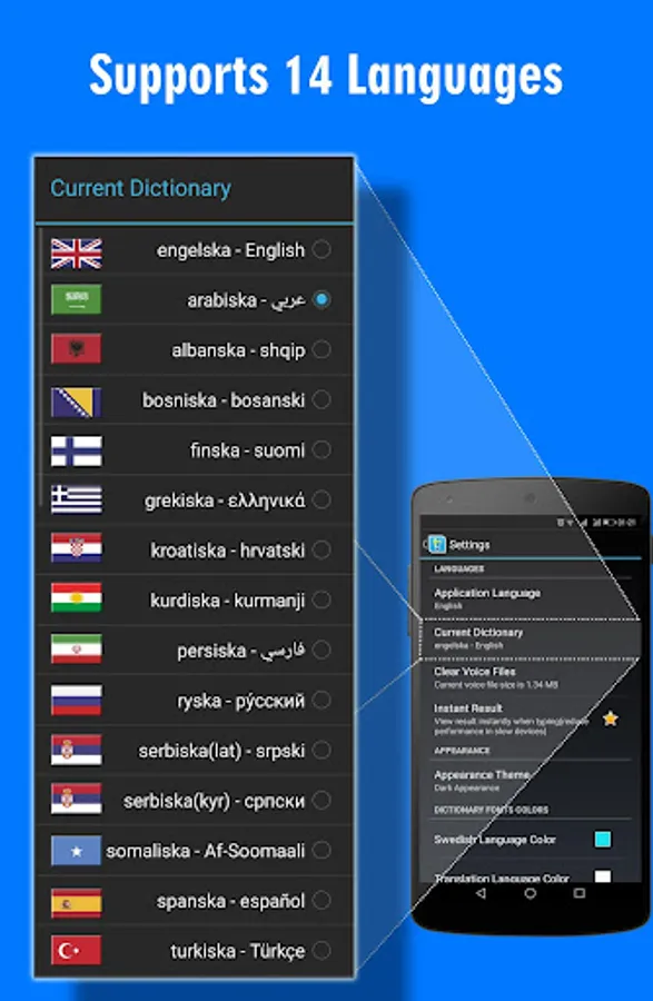 It support most of Lexin officially languages include : (Arabic, English, Albanian, Bosnian, Finnish, Greek, Kurdish, Persian, Russian, Serbian Latin, Serbian Cyrillic, Somali, Spanish, Turkish).