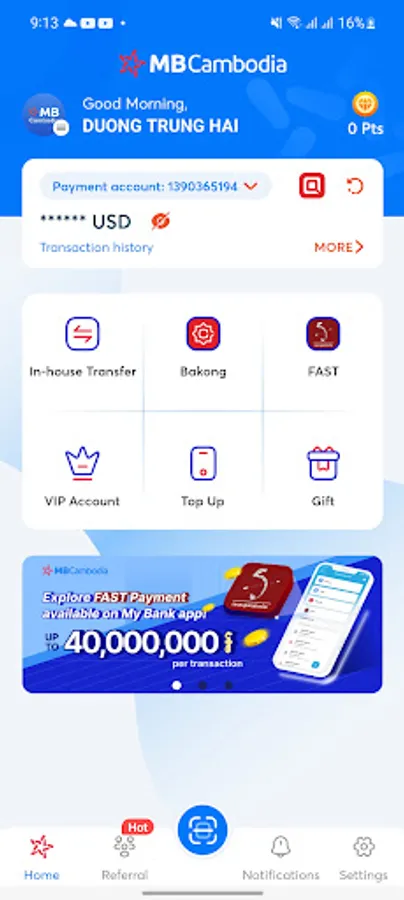 - Transfer: In-house transfer, domestic transfer via Bakong and FAST;