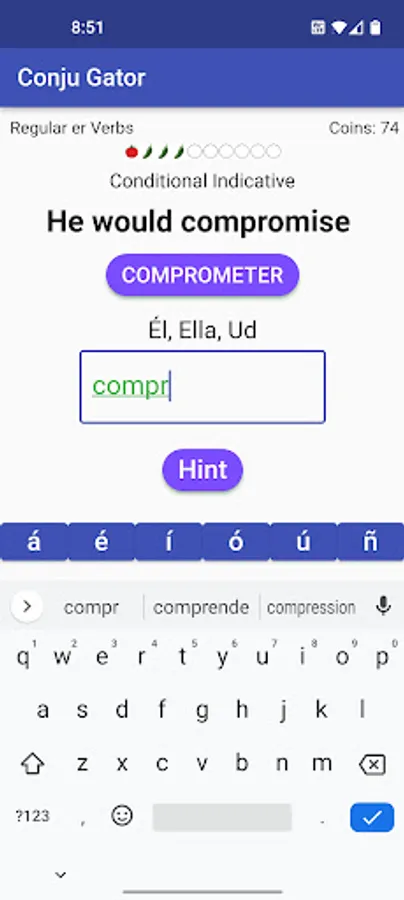 ● Hint button if you need help to correctly conjugate the verb.
