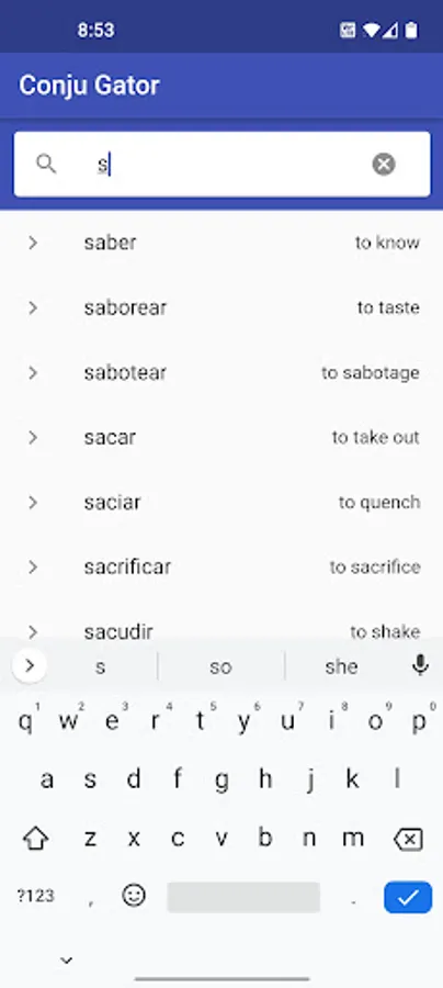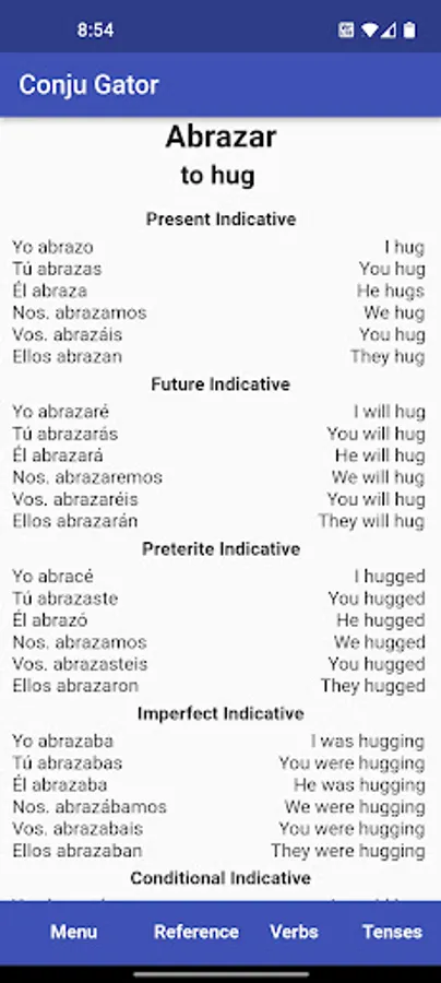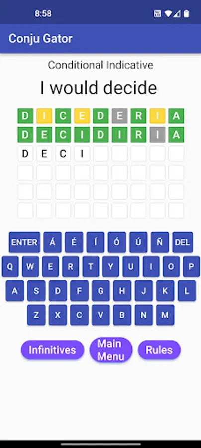 Practice conjugating 1000+ Spanish verbs with this free verb trainer. Choose between two quiz types: Multiple Choice, or the more challenging Fill in the Blank quiz. Now with a fun, newly added word game: 'Palabral' presents an English verb with six chances to guess the Spanish translation. Letter tiles turn green, yellow or grey depending on whether the letter is correct, misplaced, or not in the word.
