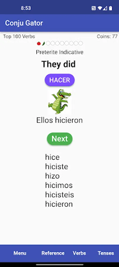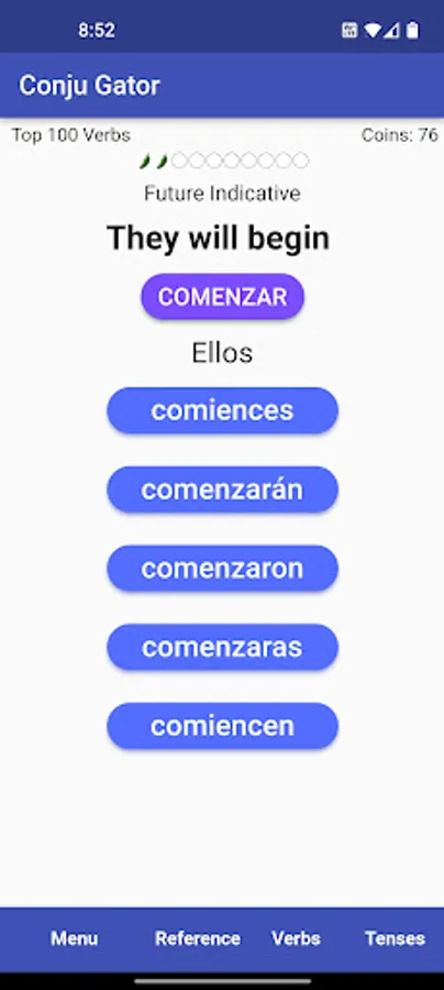 All features of the app are free to play, but some features are initially locked. Features are unlocked as you earn coins. Coins are earned for correct quiz answers. More challenging quizzes with more tenses, earn more points. Up to nine points can be earned for a single correct answer. Below are the app tenses and the verb lists available in the app, and the coins needed to unlock them.