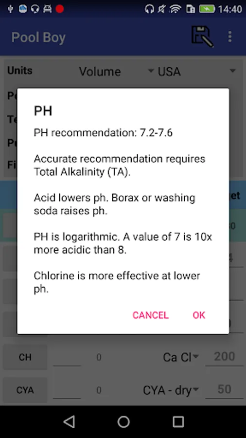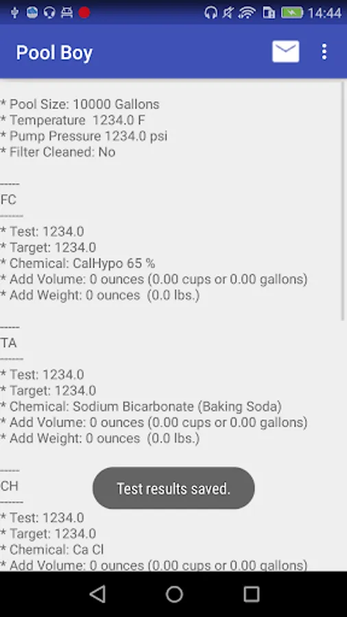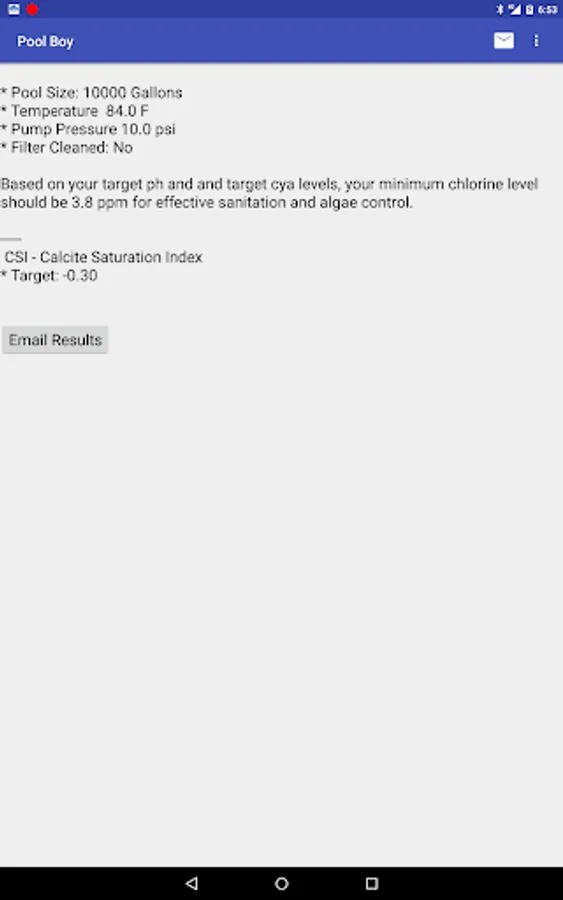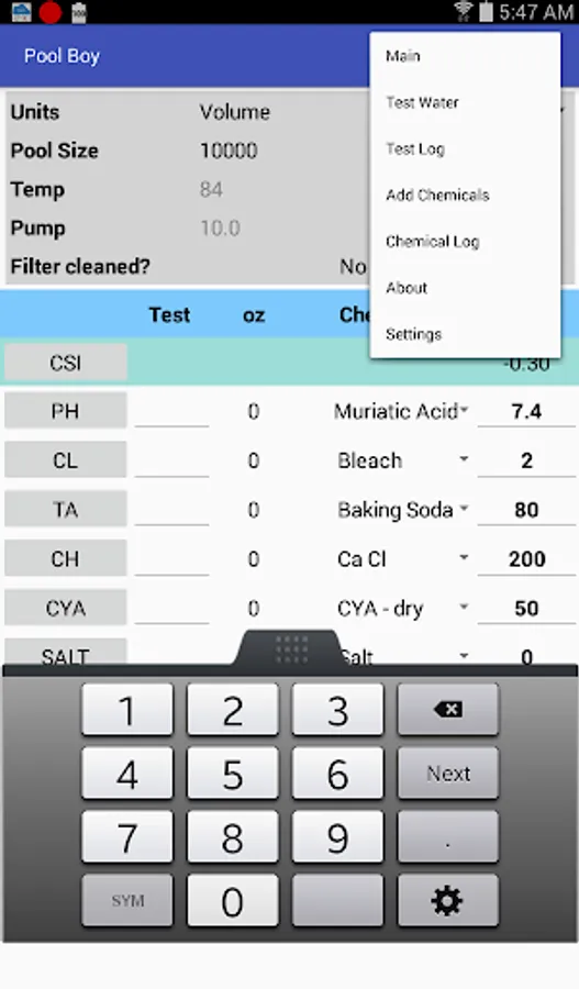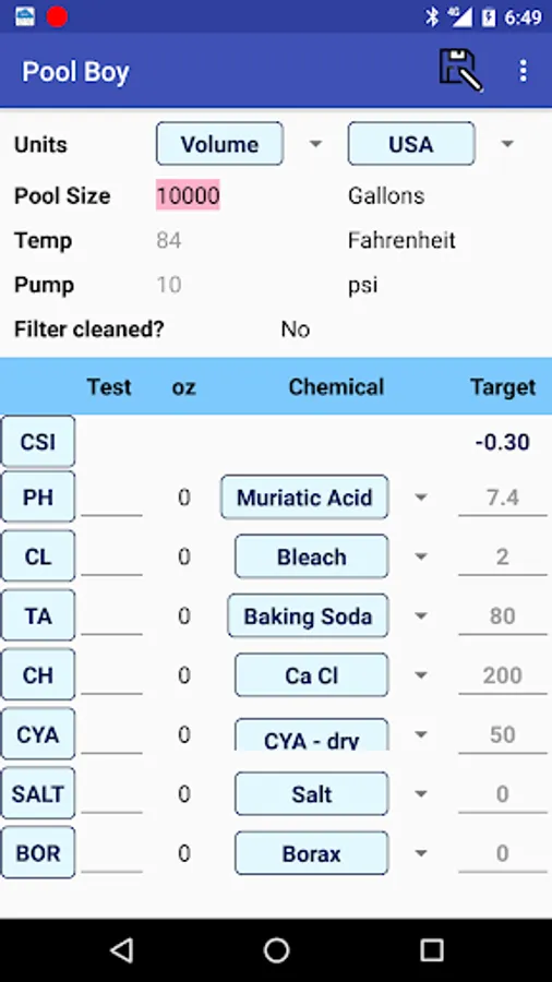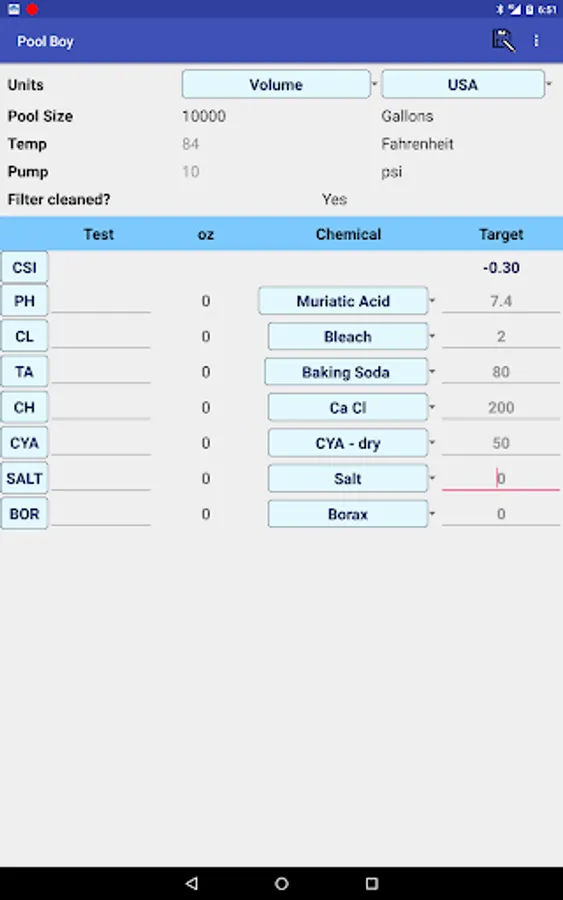 In the water testing section, enter test results for the chemical levels in your pool to calculate recommended chemical additions for pH, chlorine, alkalinity, calcium, cyanuric acid, salt and borate. Pool Boy automatically calculates the Calcite Saturation Index (CSI) to make sure your water quality is balanced. Then save, edit, email and graph your test results.
