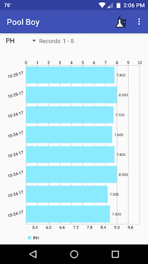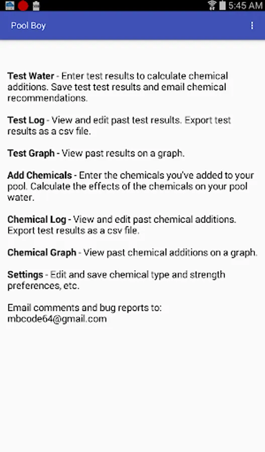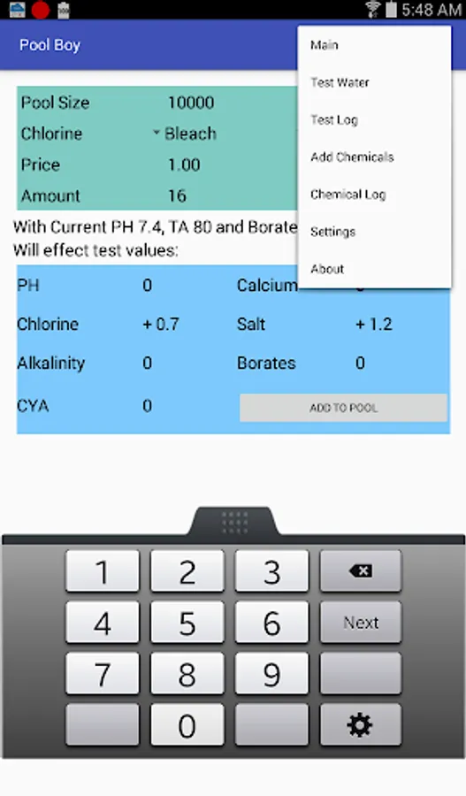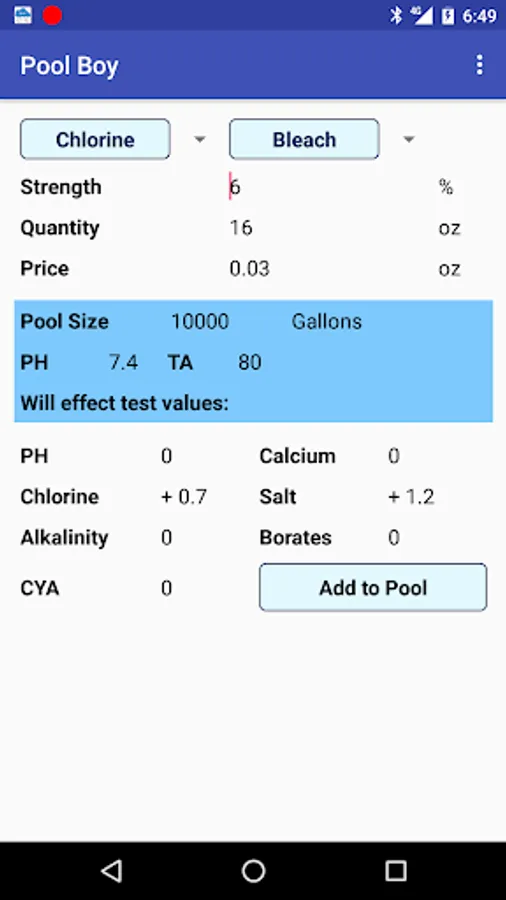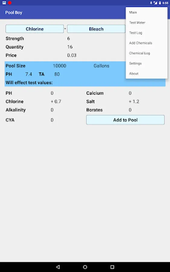 Pool Boy now tracks both water test results and chemical additions to your swimming pool.