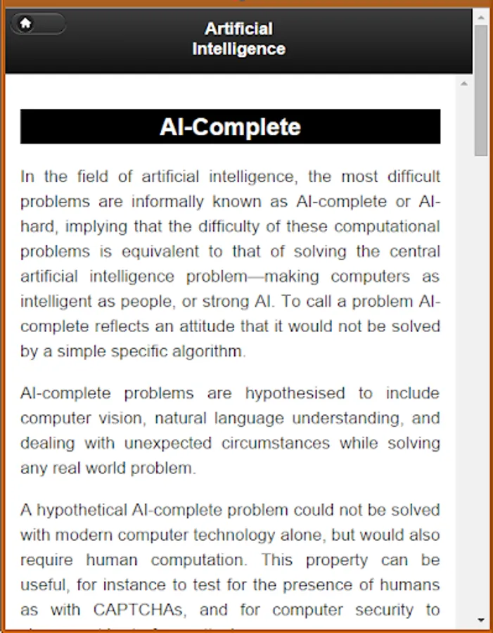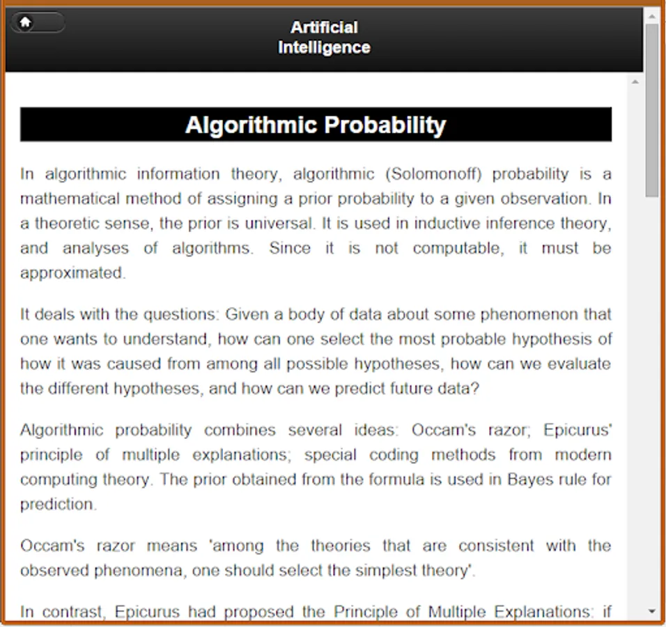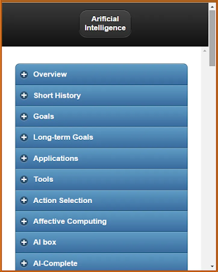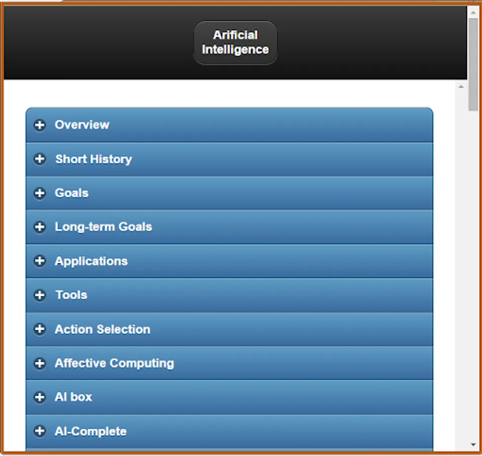 The App is about the basic Concept of Artificial Intelligence. By using this app a reader can know about the basic concept of Artificial Intelligence.