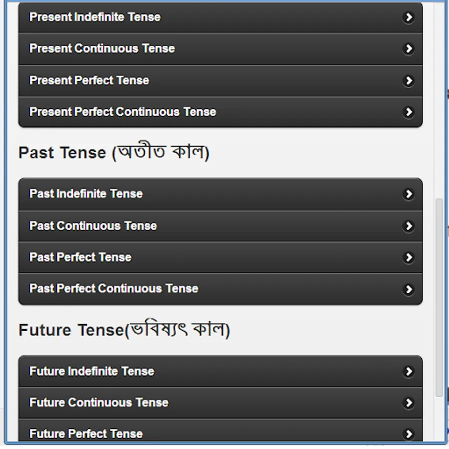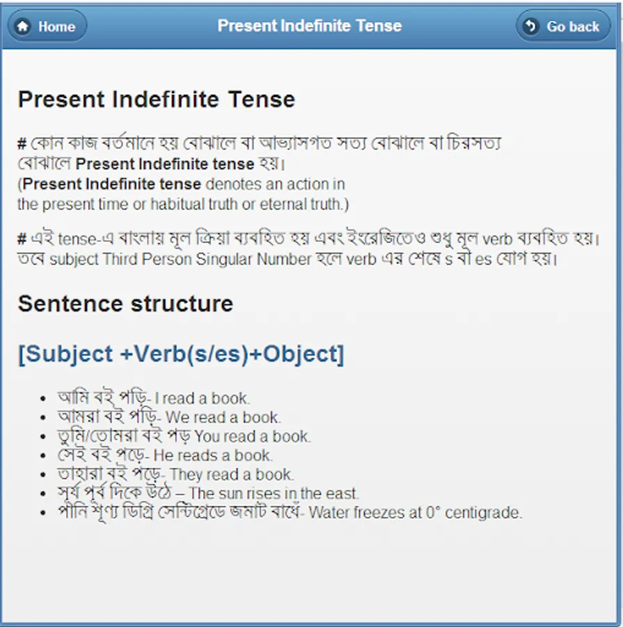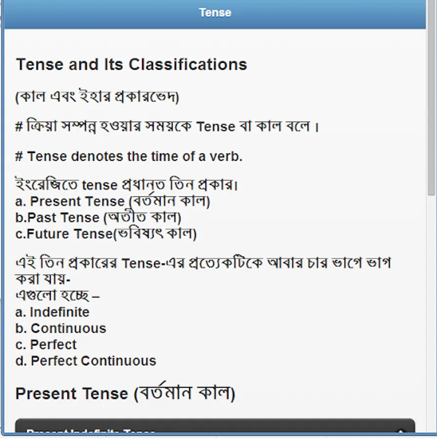 Tense is an important English Grammar lesson. If a a student can learn this lesson and can use it properly he/she can learn English language very quickly. Tense is an easy lesson. But most of the Bengali student can not learn it because of fear. I try to make tense easy in this app. I hope it will help Bengali students to learn Tense as well as English language.