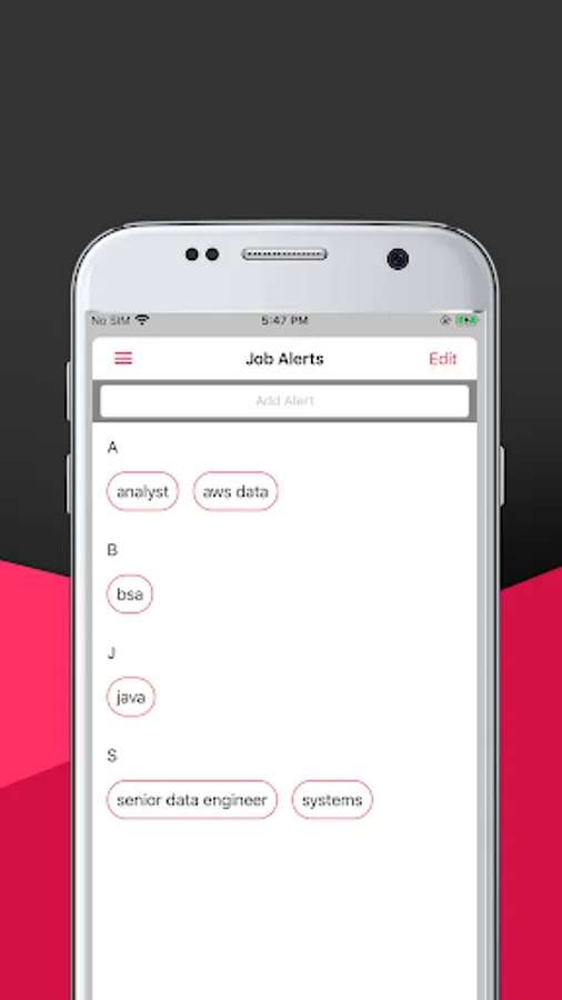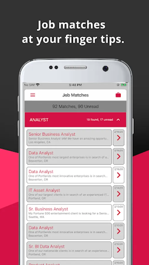 • Create Alerts for Jobs – Tap the menu, then Add Button and enter key words like technical skills, job titles, locations, etc. (e.g. San Francisco, Portland, java, Linux, project manager, etc.); Use more terms and/or titles to narrow your search.