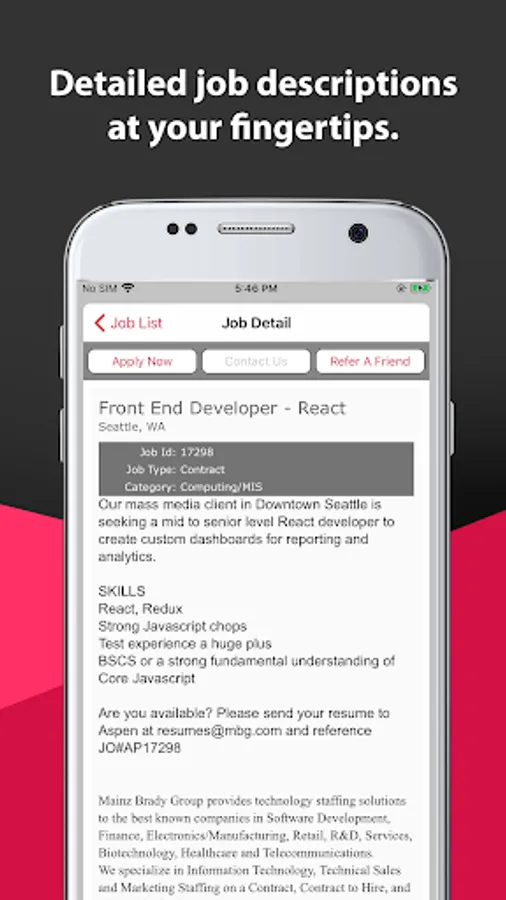 The MBG Android App will keep you up-to-date on all Job requirements from our clients and alert you the moment a position (or positions) Matches your skill set and desired work environment.