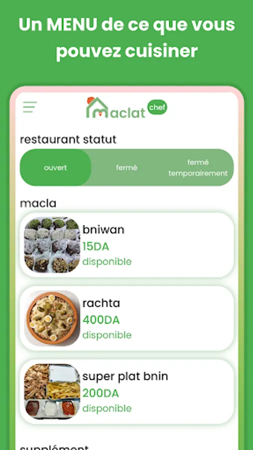 This application allows you to have a virtual restaurant in Algeria in which you sell your food to customers near you. You can customize sales, control prices all easily