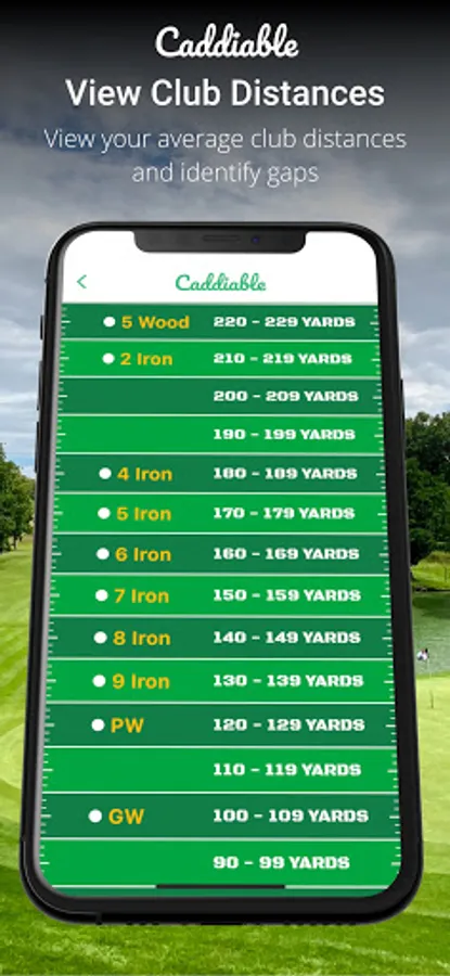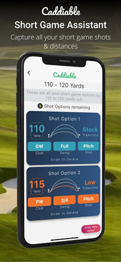 - Shotmaking Assistant (shots over 120 yards) showing possible shots within 20 yards of entered distance including technique guidance
