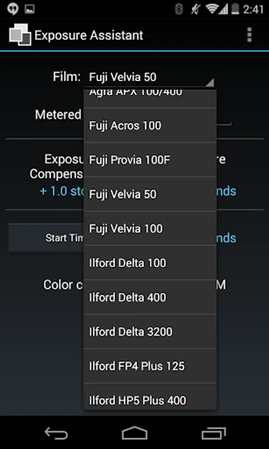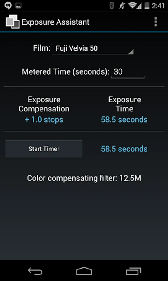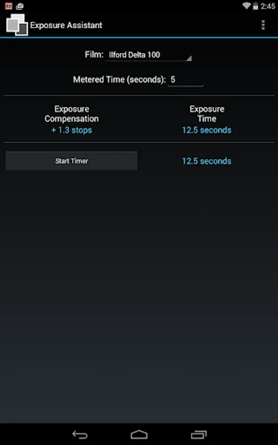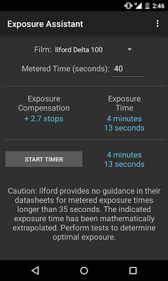 This application approximates the length of exposure for various B&W films (and some color films) in low light situations. In low light, extra exposure is needed due to reciprocity failure (also known as the Schwarzschild effect). As such, your camera's meter is not accurate in low light. This application approximates the proper exposure time (based upon manufacturers datasheets). A timer is now included in the application.