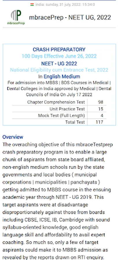 The overarching objective of this mbracePrep program is to enable a large chunk of aspirants from state board affliated, non-english medium schools run by the state governments and local bodies ( municipal corporations | municipalities | panchayats ) getting admitted in medical | dental | engineering | management | arts & humanities courses in acclaimed universities across india. This target aspirants were at disadvantage disproportionately against those from boards including CBSE, ICSE, IB, Cambridge with sound syllabus-oriented knowledge, good english language skill and affordability to avail expert coaching. So much so, only handful of aspirants are able to make it to admission as revealed by the reports drawn on RTI enquiry. Such simmering inequality motivated launch of this preparatory program to prepare the aspirants thoroughly and effectively by providing them with content to learn in language medium they have studied, expert guidance and an array of tests to practice as to enable them comprehend, remember and recall reflexively, flawlessly on the D-Day of Test.
