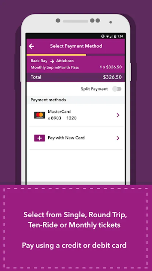 With the new MBTA mTicket App for Commuter Rail and Ferry, you can securely purchase MBTA Commuter Rail and Ferry Single Ride, Round-Trip, 10 Ride, and Monthly tickets in seconds. Purchasing a ticket is easy: select your trip & ticket type, enter your payment card information and your smartphone is your ticket!