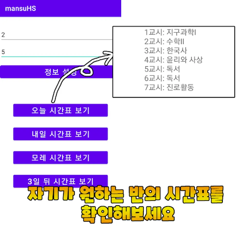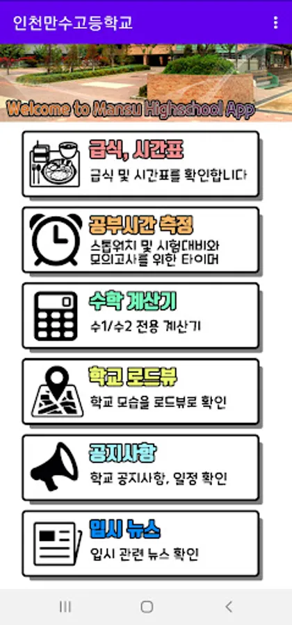 Meals/timetable check, study time measurement, math calculator, school road view, school notice, news related to entrance exam, etc.