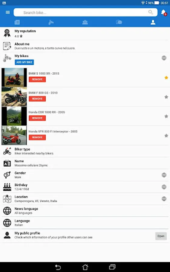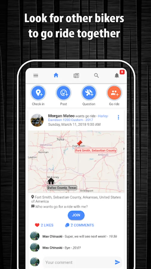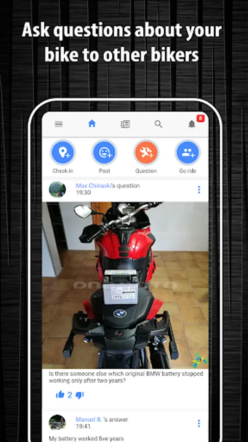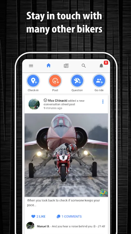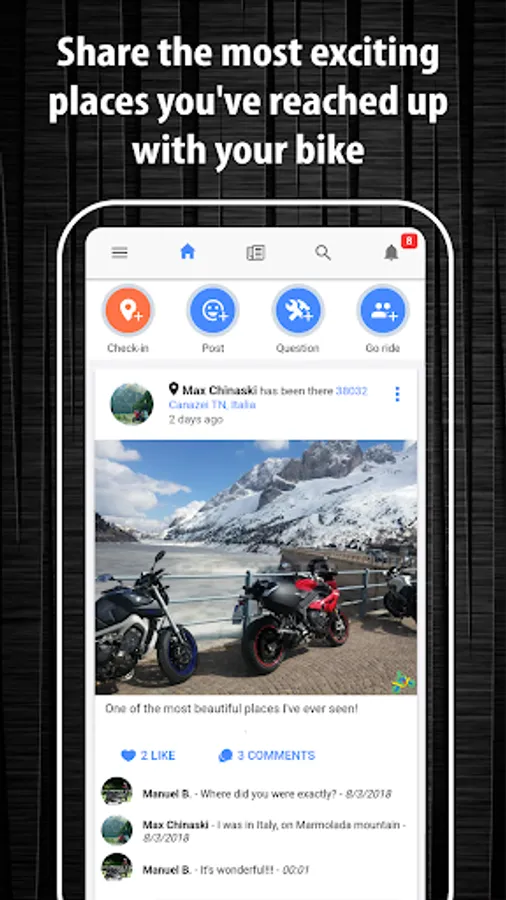 • Share pictures of your last weekend bike travel with other users on the home wall.
