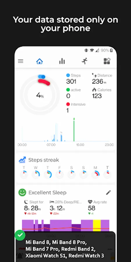 - π Workout session: track and analyze each of your sessions (steps, heart, calories, GPS)