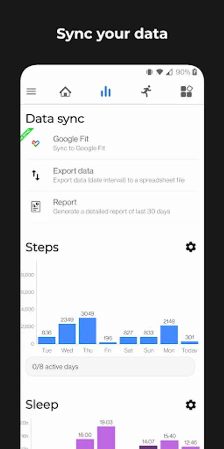 Track all your health data including workouts, steps, sleep, heart, calories and weight. Compare your week statistics to get better goals.