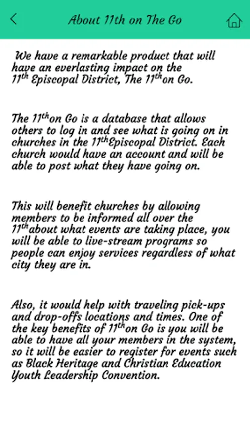 EleventhonGo has proved to be a remarkable product and is truly serving the present age and reaching the masses. The app has serviced various churches within the episcopal district and the YPD. The app has live streamed services and granted accessibility to members who may have not been able to attend a meeting or convention, allowing them to view services regardless of what city they are located in. Consumers are able to watch sermons and feel the transforming power of the word of God and be inspired by the ministry of churches. One of the key benefits of EleventhOnGo is having the ability to give tithes and offerings. Often times at district wide events Givelefy is not available. In this technological age the use of checks is decreasing among millennials. The app will also provide a way for members to give electronically. Donations and mission offerings can be received through the app, thus generating profit for the Kingdom of God . The app has streamlined registration processes for local YPD directors and Christian Education directors for annual days, Bible Discovery Conventions, Christian Education Youth Leadership Congress, and Black Heritage Weekend. In addition, EleventhOnGo has served as an asset to members by allowing them to stay informed regarding news and information across the district and connectional church. Initially, there were issues with software compatibility and certain capabilities. The team met and reviewed the app with the software engineer and app developer, and were able to make some important changes. The app is super user friendly and caters to all ages, and can be utilized by local congregations, conference branches, and the episcopal district. EleventhOnGo is burgeoning to be the next big thing for the global church and has demonstrated its impact and efficiency to the body of Christ.