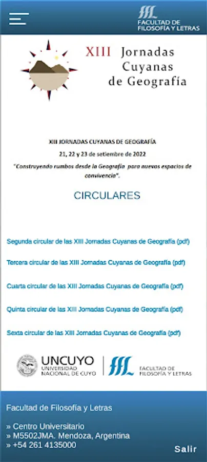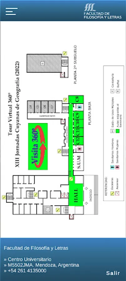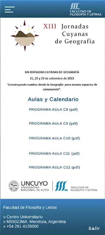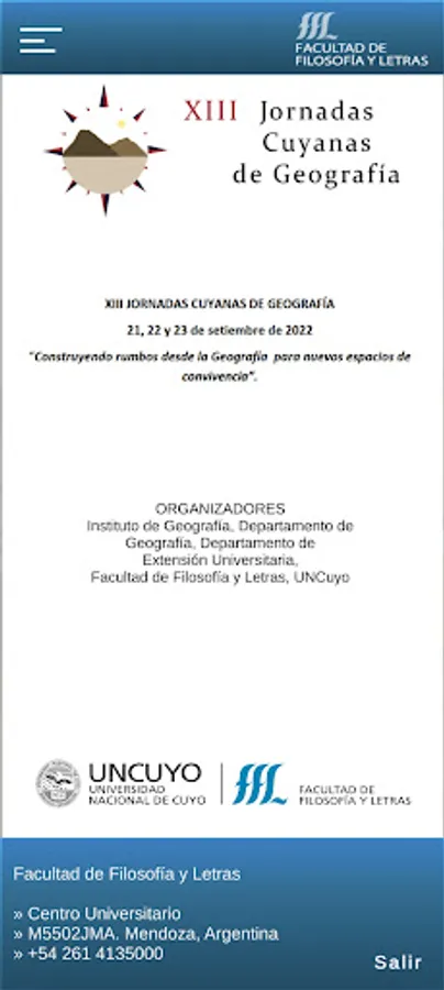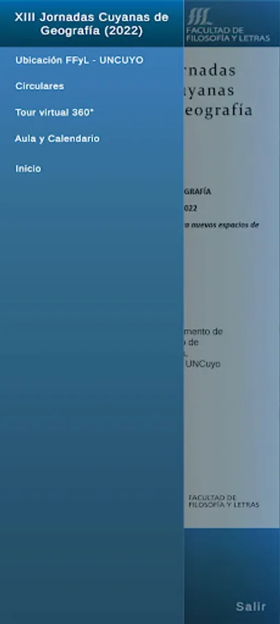 La aplicación XIII Jornadas de Geografía, contiene tour virtual con imágenes 360° de las locaciones en donde se realizarán las XIII Jornadas Cuyanas de Geografía (2022), en la FFyL de la UNCuyo, Mendoza, Argentina.” Se desarrollarán los días 21, 22 y 23 de septiembre de 2022 con modalidad mixta (presencial y en línea). Son organizadas por el Instituto de Geografía, el Departamento de Geografía y la Secretaría de Extensión Universitaria de la FFyL de la UNCuyo.