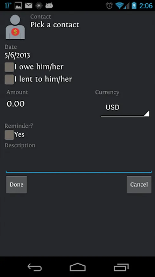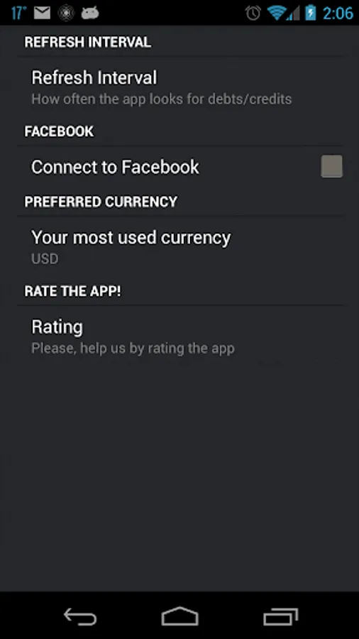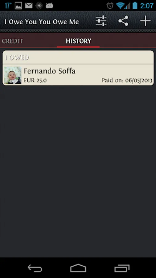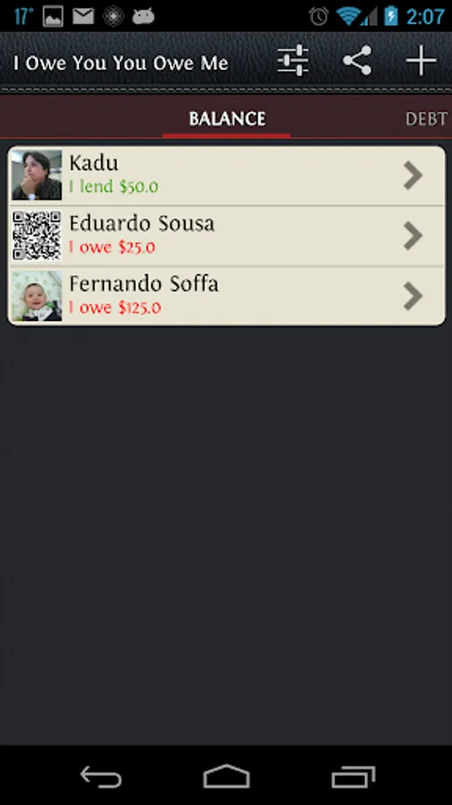 This is the best version to date! You can now connect the application to Facebook and create debts and credits for your Facebook friends. If you Facebook friend also has the I Owe You You Owe Me application and is also connected to Facebook, he will immediately get a notification telling him/her of the event you created!