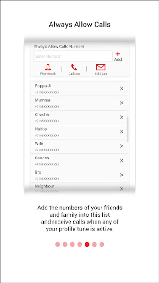 • Always Allow Calls- User can add numbers to this list from which they want to receive calls from when the profile is activated.